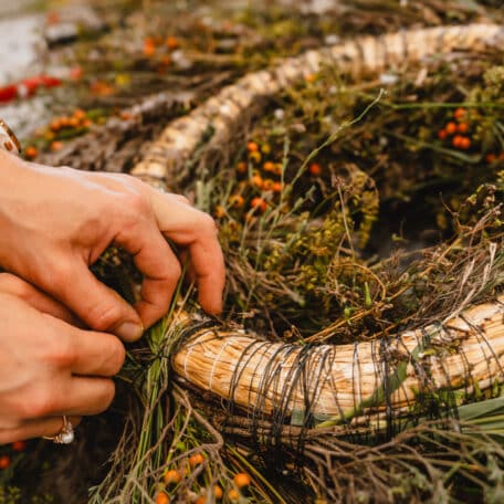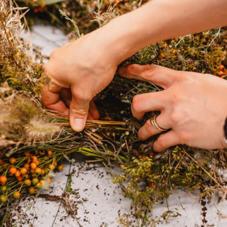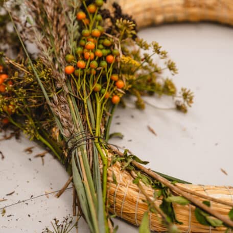 Enrouler le fil de fer une fois autour de la couronne de paille et tordre les deux extrémités du fil de fer l'une dans l'autre de manière à ce que le fil soit fixé. Faire de petites touffes avec le matériel végétal, les placer sur la couronne de paille et les fixer avec le fil de fer. Utiliser des bouquets un peu plus grands à l'extérieur et un peu plus petits à l'intérieur.