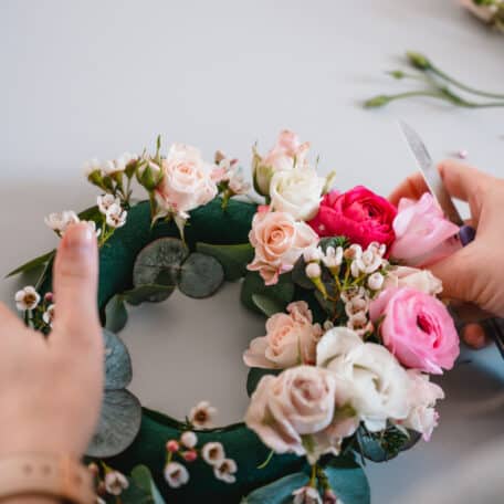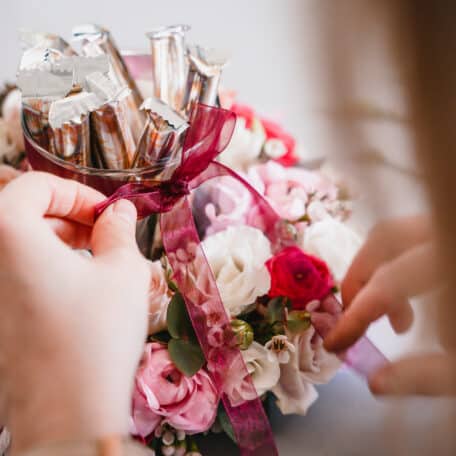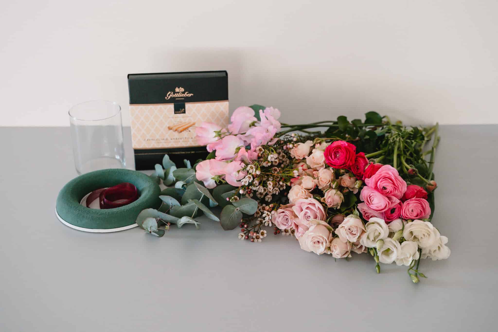 Place le récipient dans la couronne de fleurs et remplis-le de bouchées Gottlieber. Pour couronner le tout, embellis le récipient avec du ruban et un joli nœud.