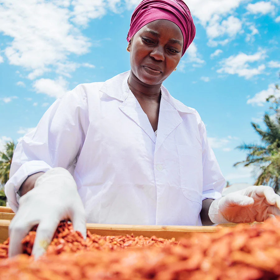 Les piments sont cueillis à la main lorsqu'ils sont mûrs. Après le tri, les piments sont soigneusement séchés au soleil avant que les dernières tiges ne soient retirées sur la table de tri. Nos agriculteurs se trouvent principalement sur la partie continentale de la Tanzanie, dans la région de Kigoma.