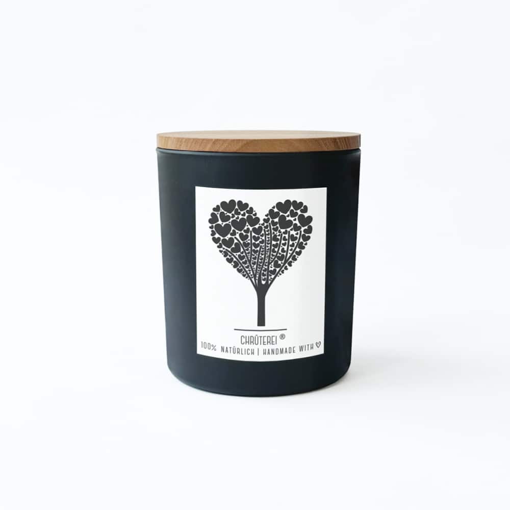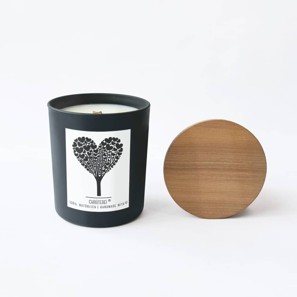 Noble bougie parfumée 100% naturelle (cire de colza) avec mèche en bois et couvercle en bois.