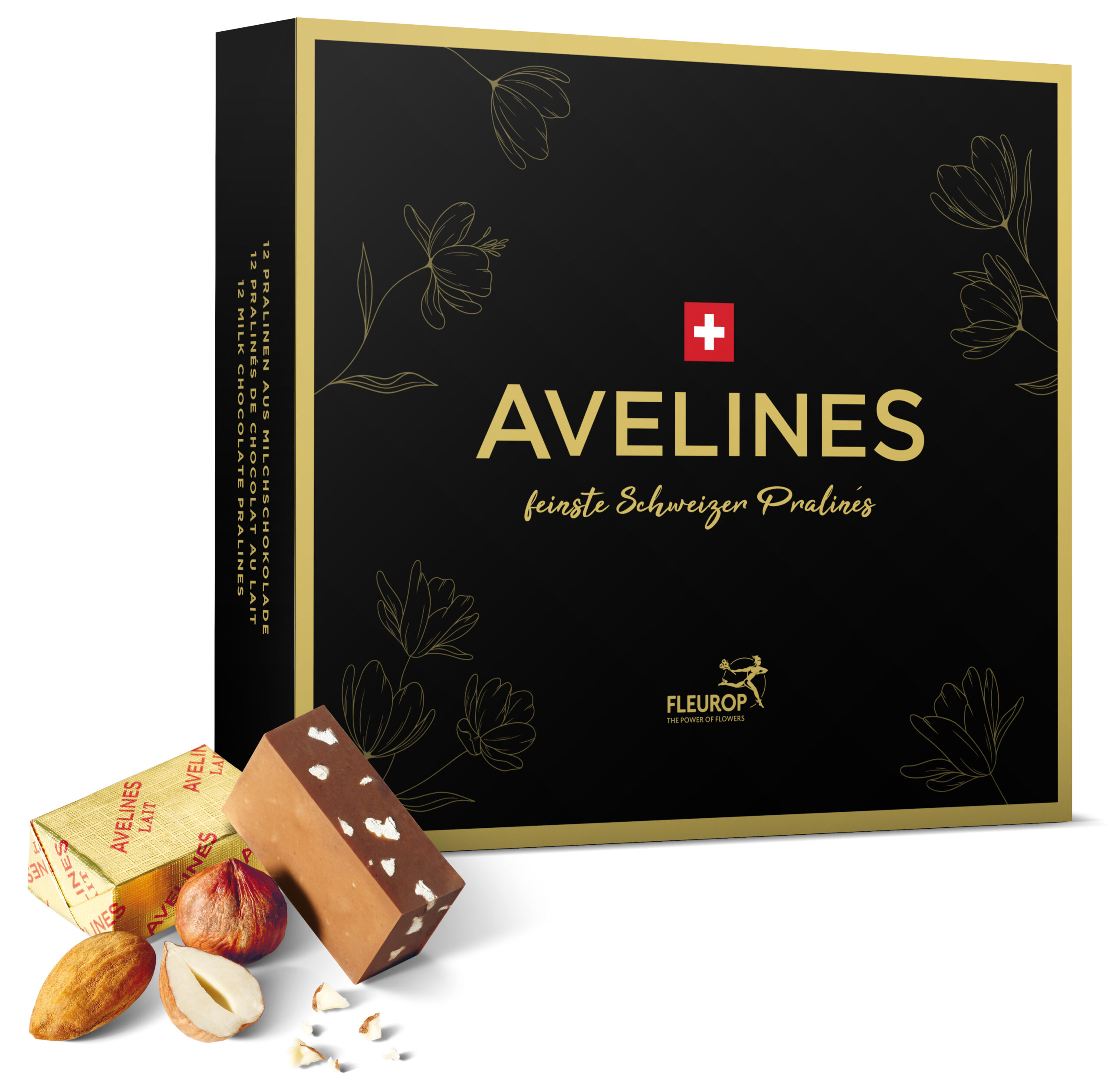 Cette élégante boîte contient 12 pralinés Avelines (120g) au chocolat au lait fondant aux noisettes Gianduja. La composition raffinée ne contient que les meilleurs ingrédients d'origine soigneusement sélectionnée : des fèves de cacao, du lait entier suisse, des noisettes délicatement grillées, des amandes et de la véritable vanille Bourbon moulue.