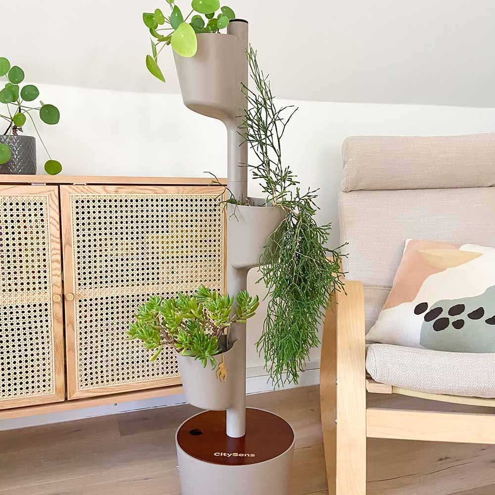 - Jardinière au design vertical. Disponible en deux tailles : 3 ou 4 pots ; et quatre couleurs : Gris, écorce de pin, noir ou blanc.