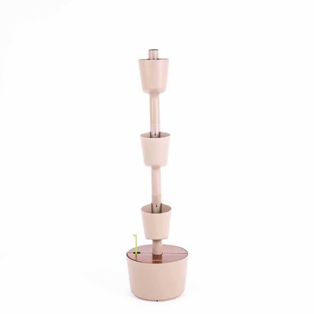 Jardinière verticale de couleur écorce de pin et couvercle en teck. Modulaire et adaptable. Modèle avec 4 pots. Place les pots dans différentes positions. Hauteur 148 cm. Diamètre des pots 13 cm.