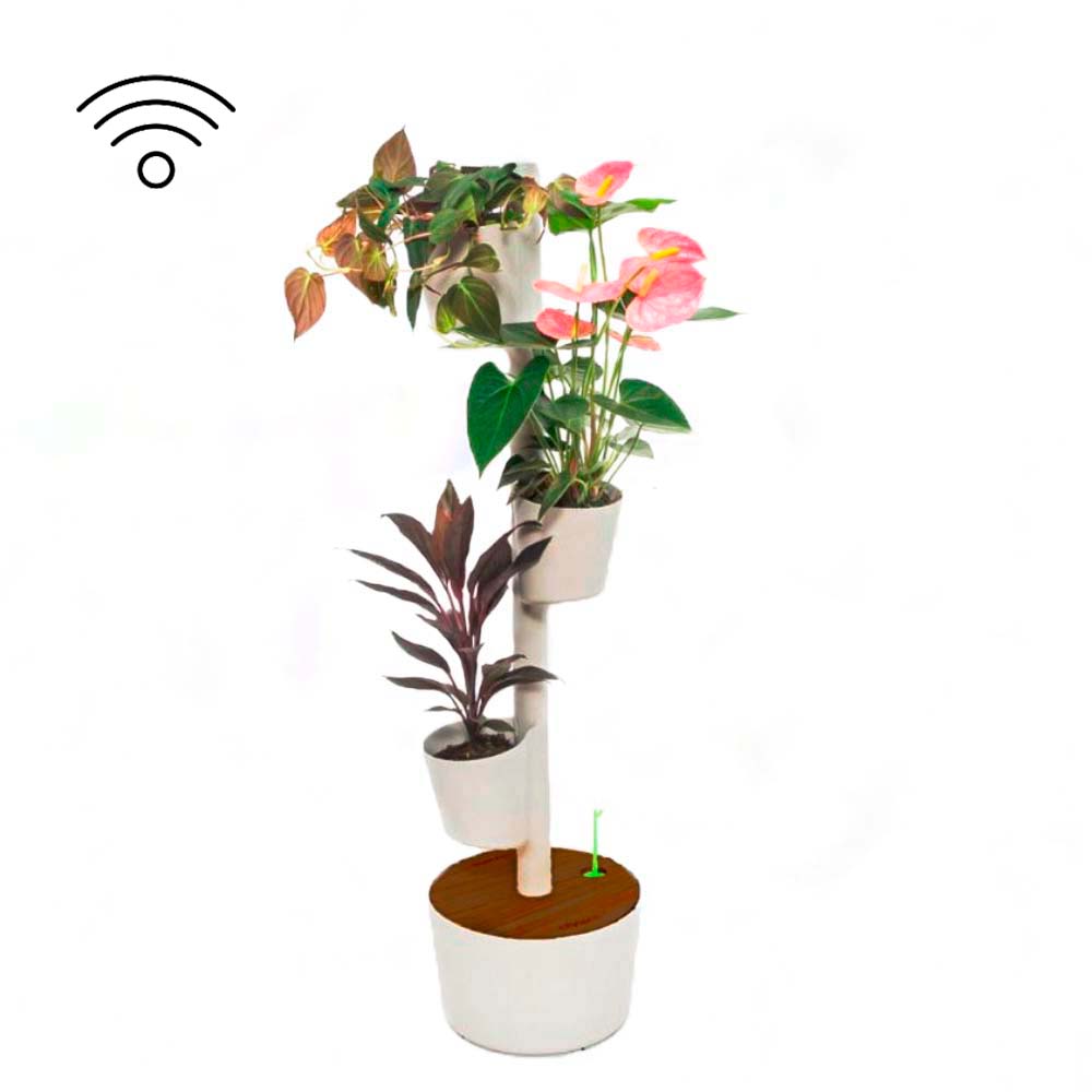Jardinière verticale intelligente avec auto-arrosage en gris et couvercle en teck. Modulaire et personnalisable. Gère l'arrosage de tes plantes avec Alexa et Google Assistant. Modèle avec 4 pots. Hauteur 148 cm. Diamètre des pots 13 cm. Inclut des nutriments de première qualité. Avec système d'arrosage automatique en circuit fermé avec 30 jours d'autonomie.