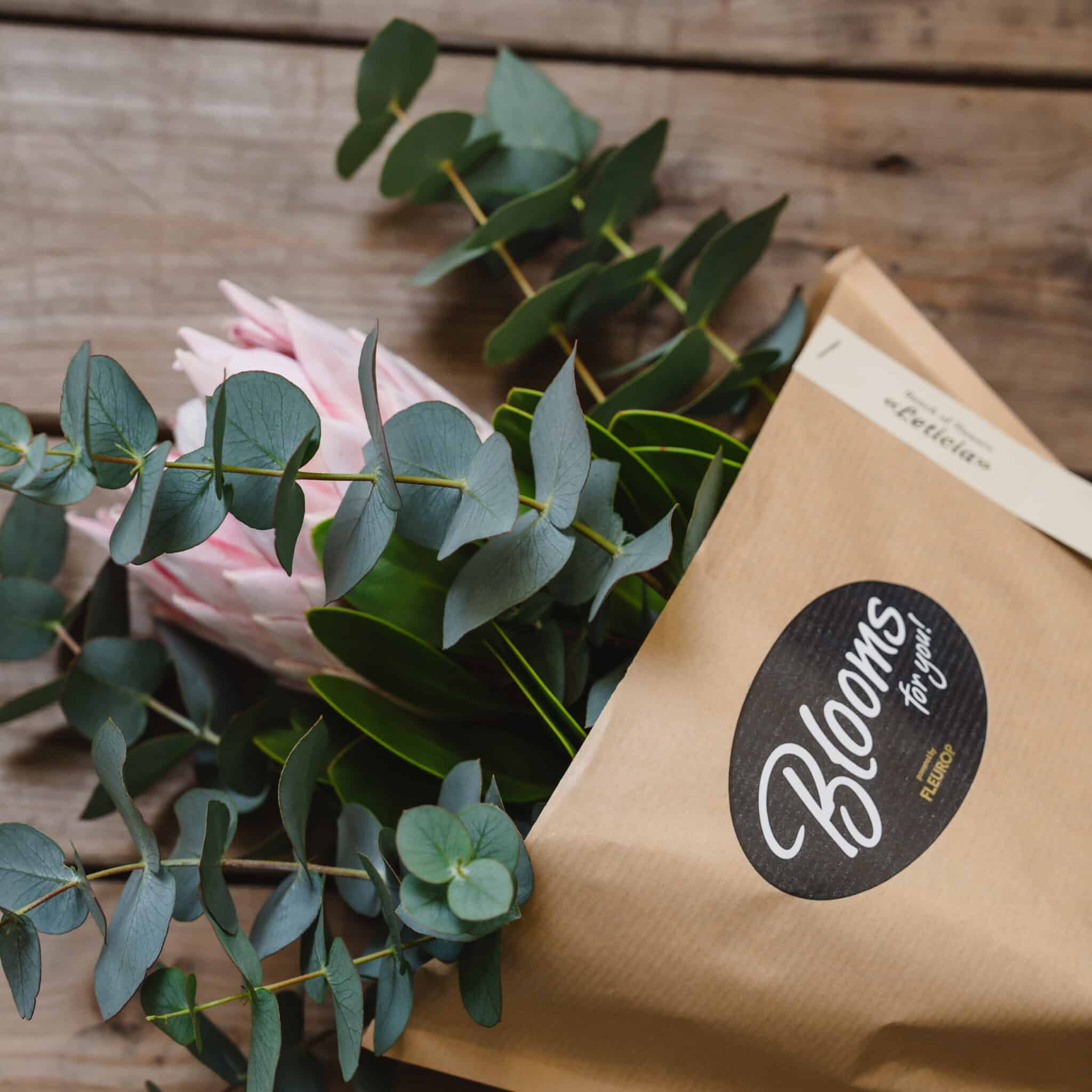 Protée royale en rose avec eucalyptus, dans un sac à fleurs en papier kraft