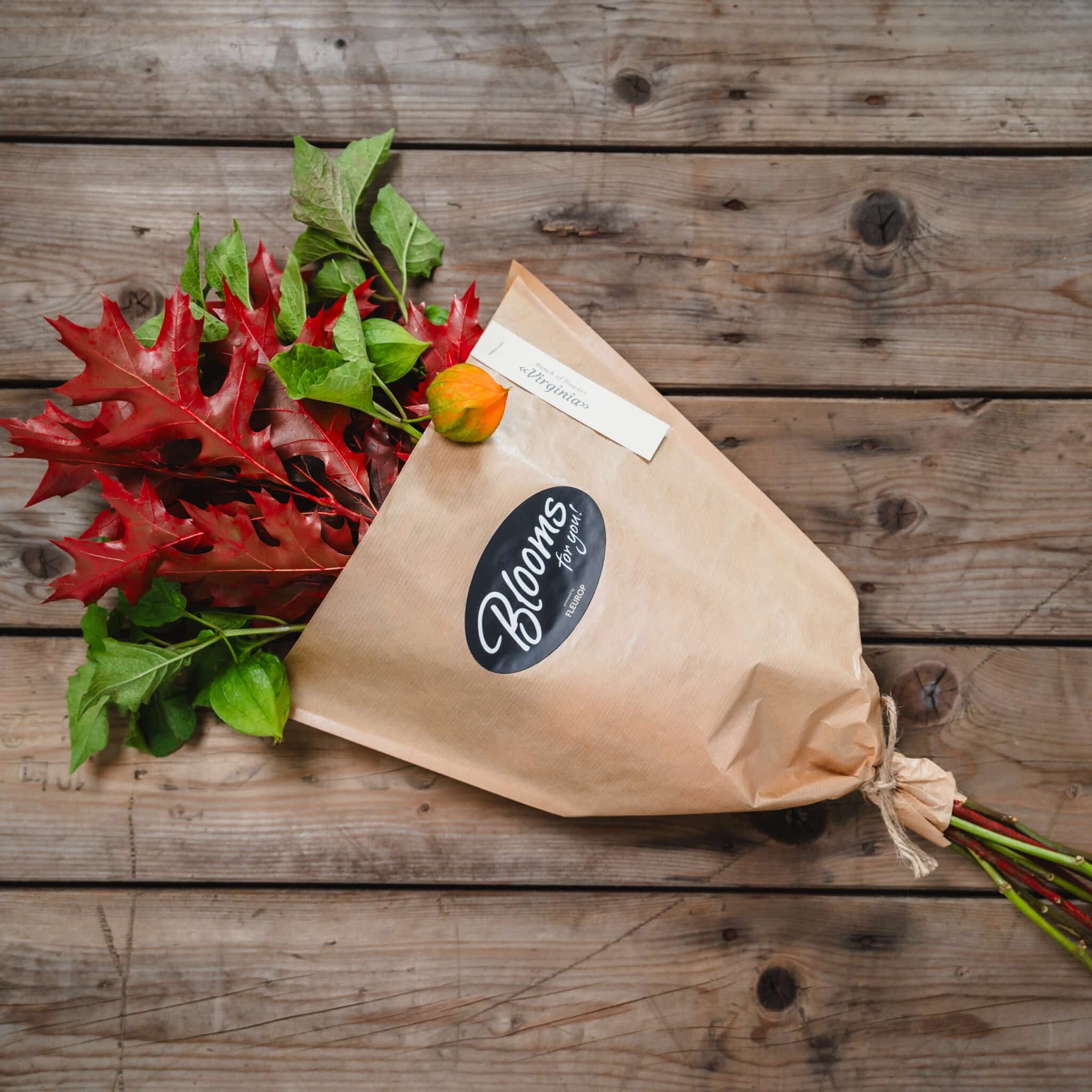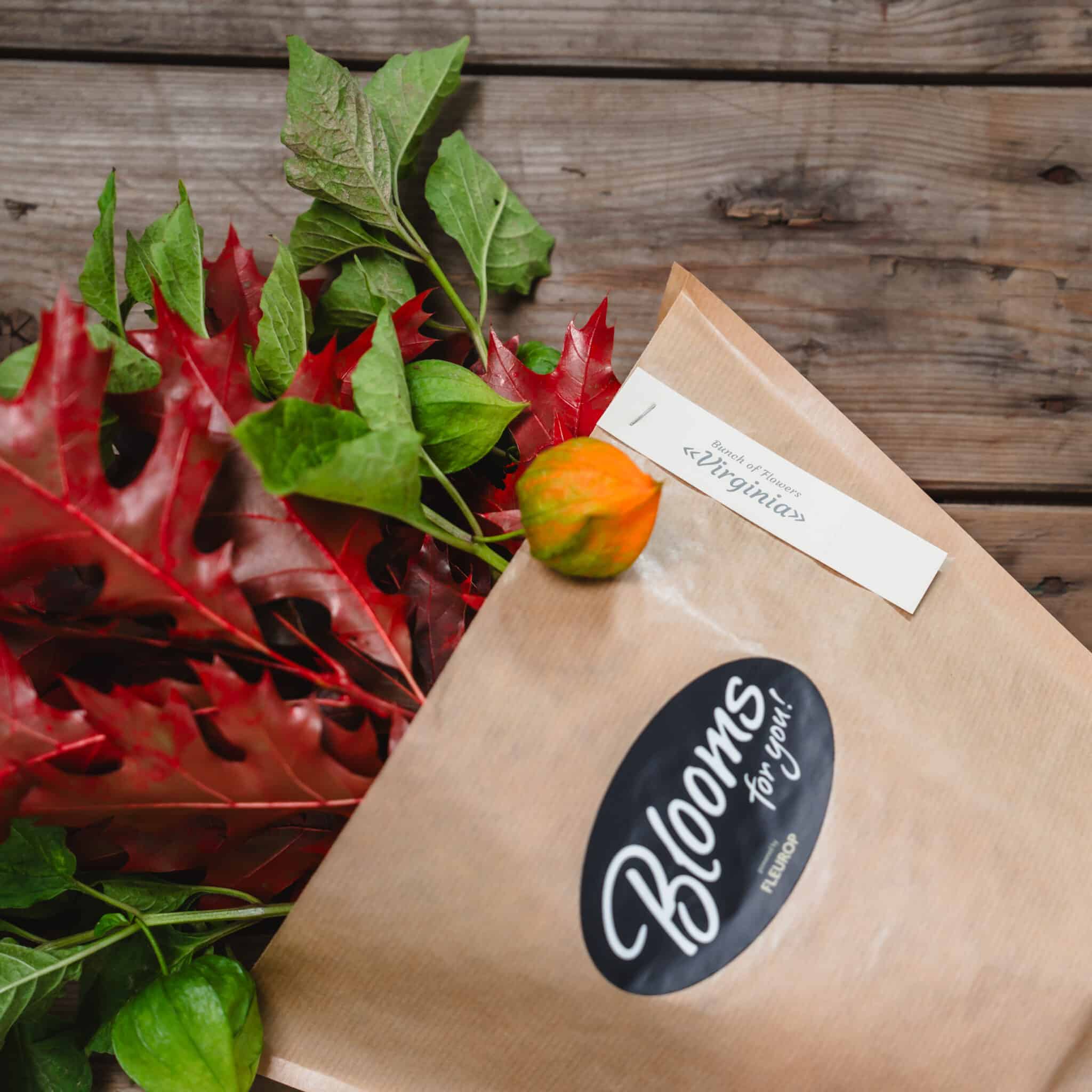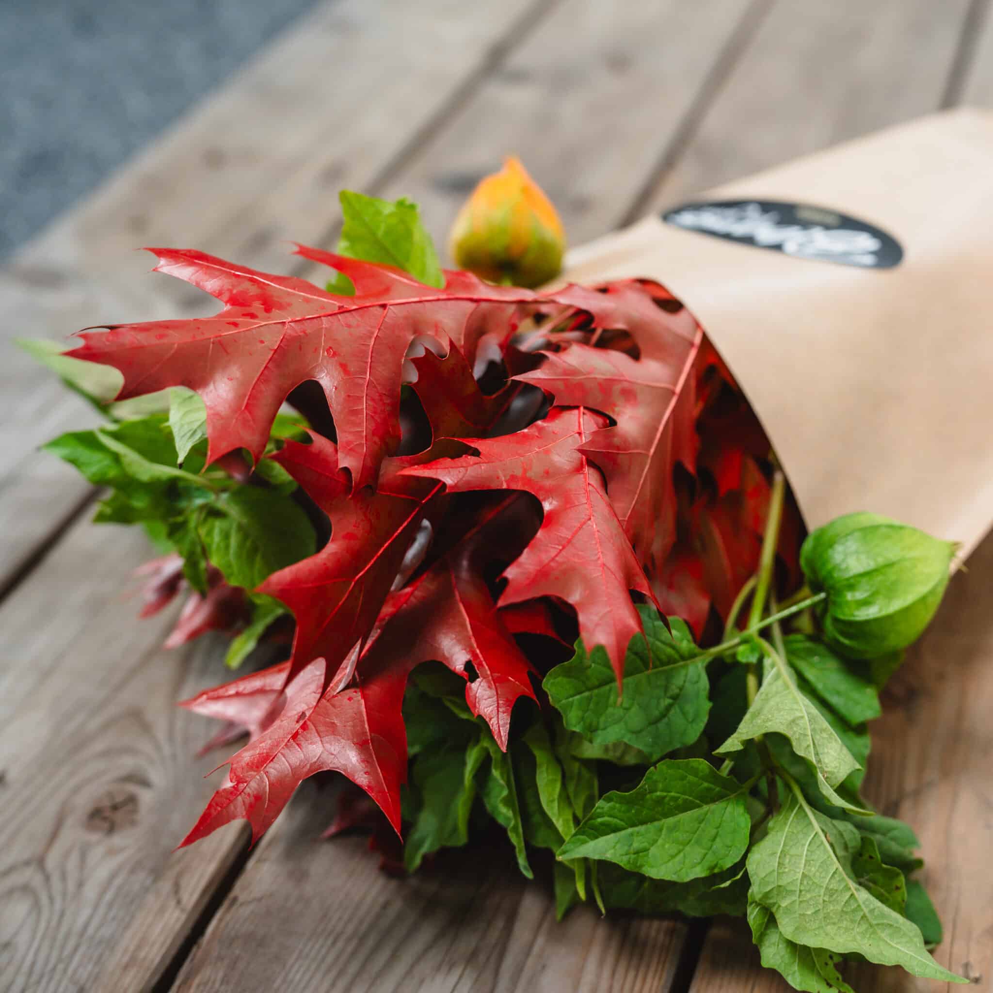 Physalis (5 tiges) avec feuilles de chêne, dans un sac à fleurs en papier kraft