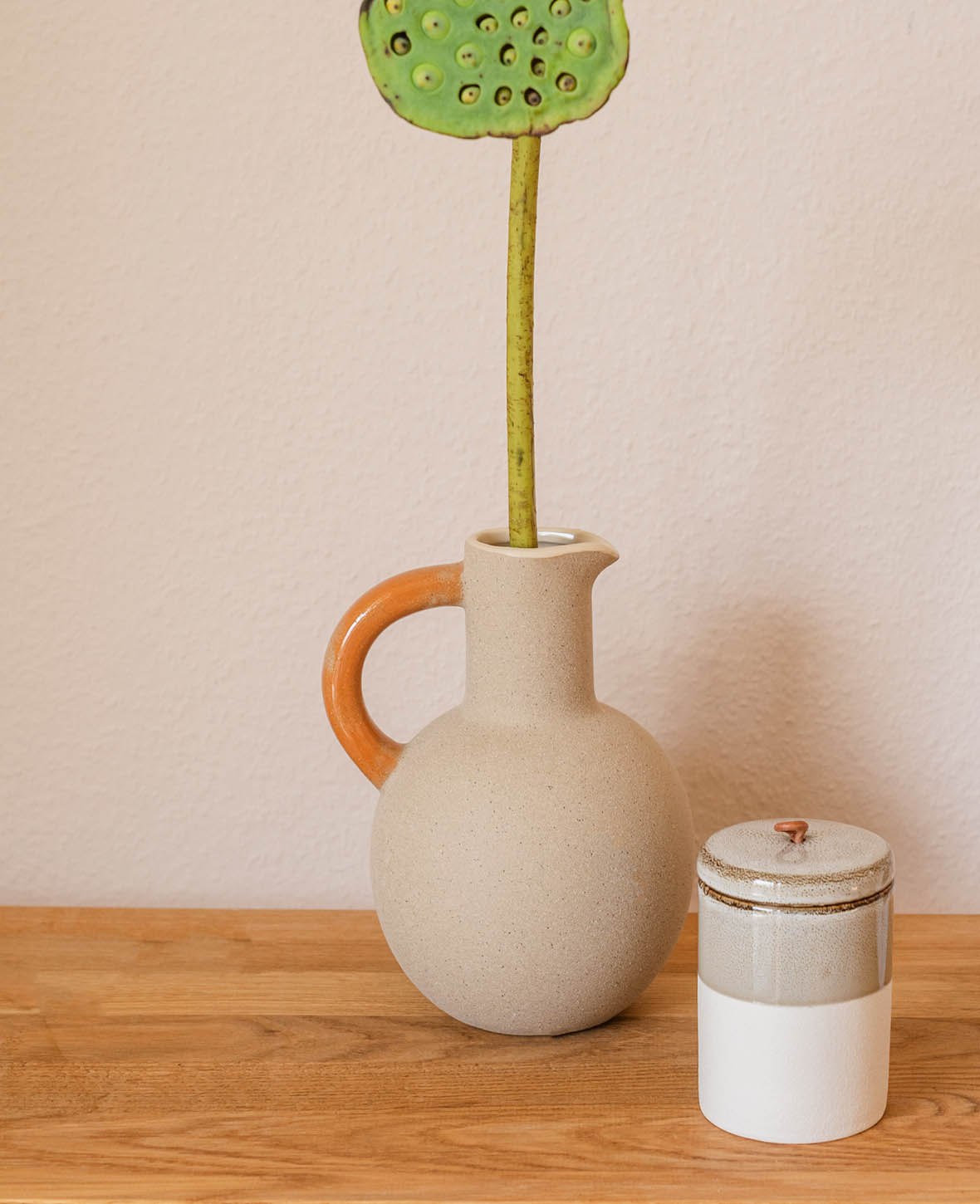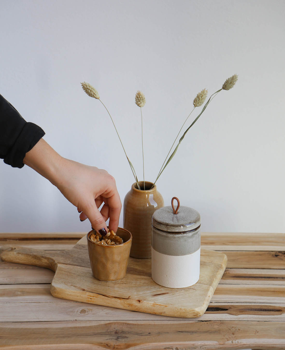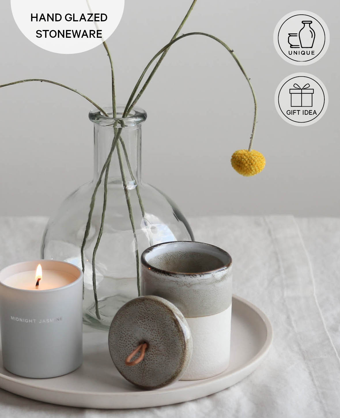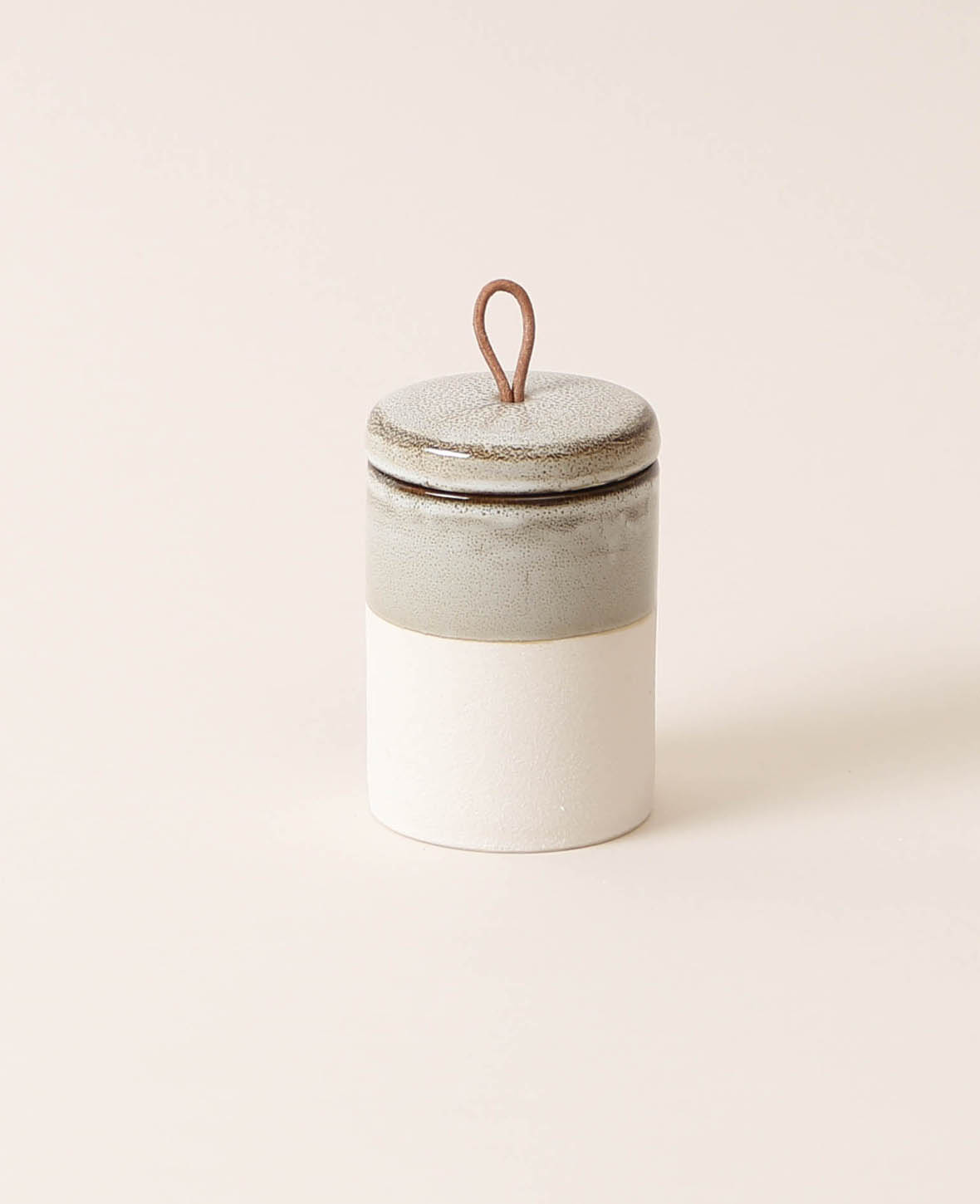 Boîte de rangement ronde grise en faïence avec couvercle et poignée en cuir, Ø 7.5 cm x H 10.5 cm, 275 ml