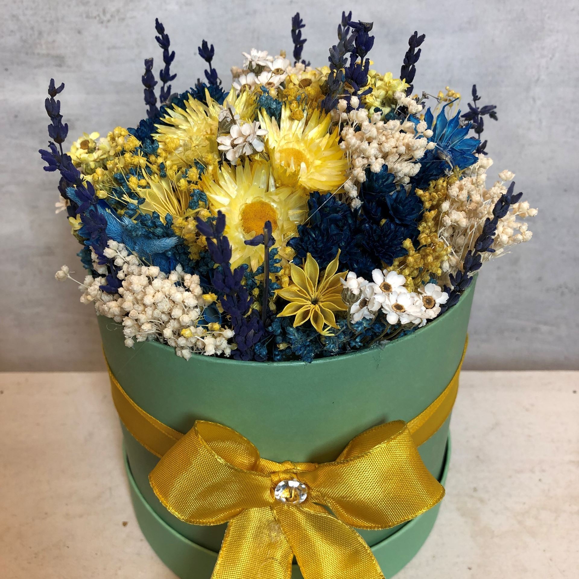Avec ce cadeau tendance, la surprise sera inoubliable. Notre boîte est décorée de fleurs séchées tendance, d'un ruban et d'un accessoire en pierre précieuse. Le couvercle de cette boîte élégante peut également être réutilisé pour ranger de belles choses.