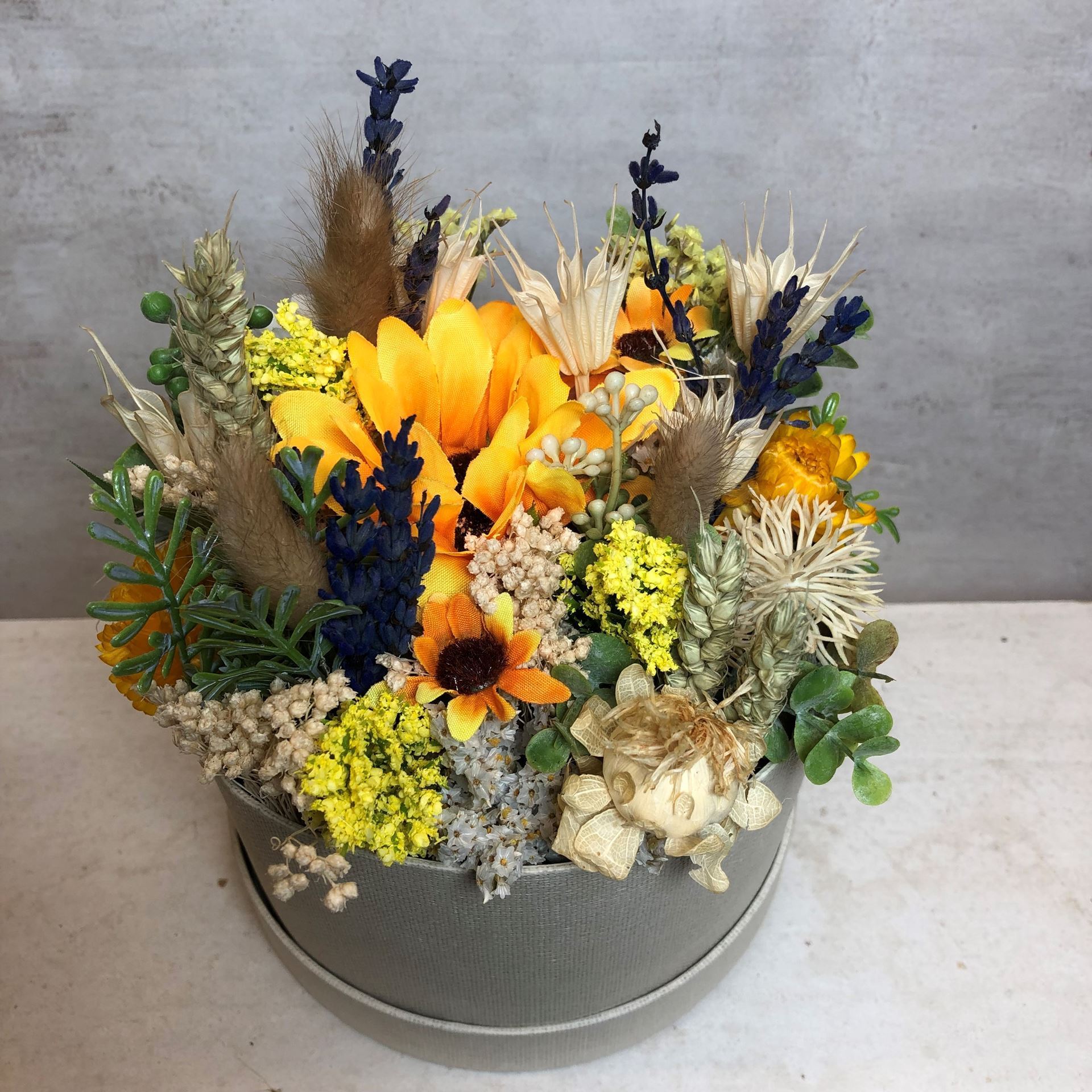 - Les boîtes à fleurs en fleurs séchées, fleurs textiles & matériaux artificiels sont composées individuellement par nos soins et peuvent donc varier en termes de disposition et de couleur.