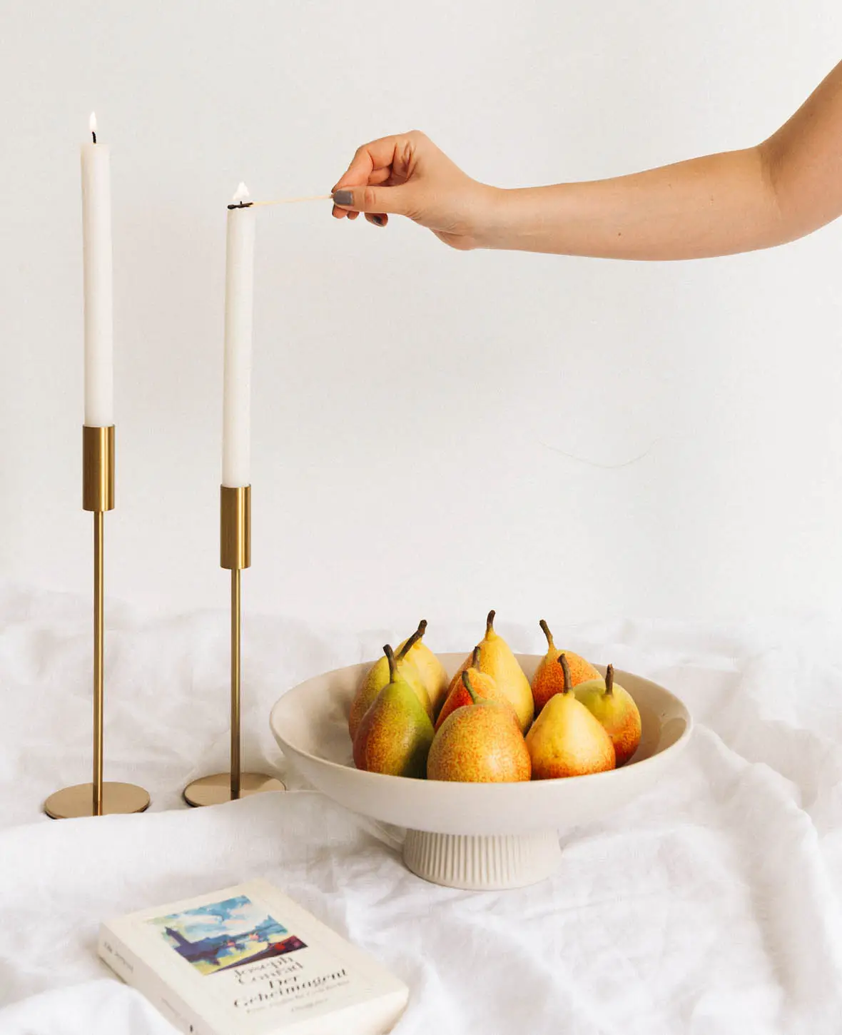 Notre élégant chandelier en laiton doré brillant ajoute une touche d'élégance à ta maison ou à des occasions spéciales comme un mariage ou une fête. Ce chandelier de 30 cm de haut est spécialement conçu pour les bougies à tige et pointues et s'harmonise parfaitement avec nos autres options de taille (25 cm et 20 cm) pour des compositions élégantes. Grâce à la base en velours, tes meubles ne seront pas rayés pendant que tu profiteras de la chaleur et de la beauté des bougies.