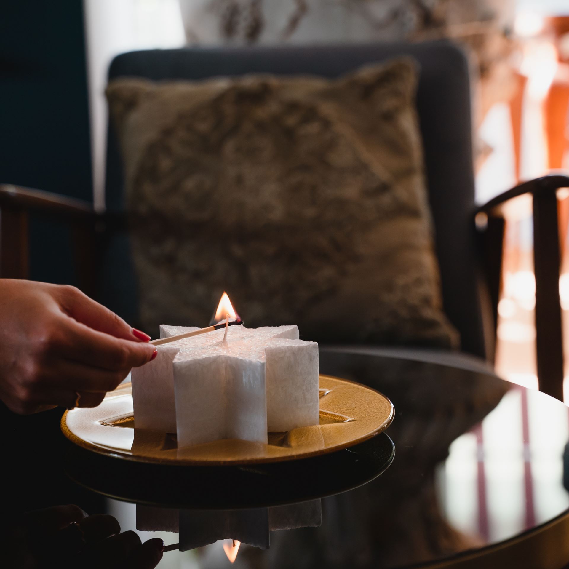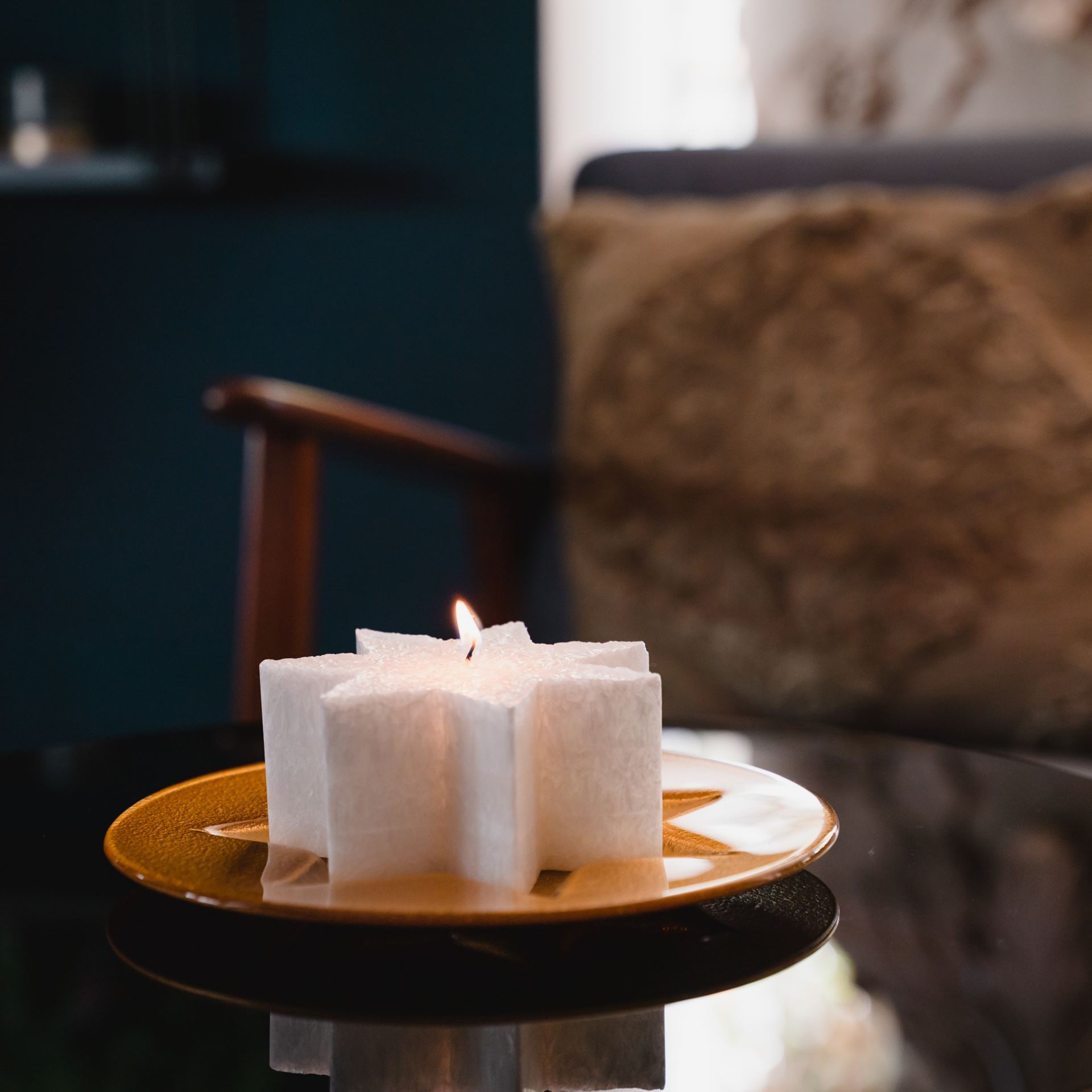 Bougie étoile stéarine avec base en verre doré en blanc neige ou champagne