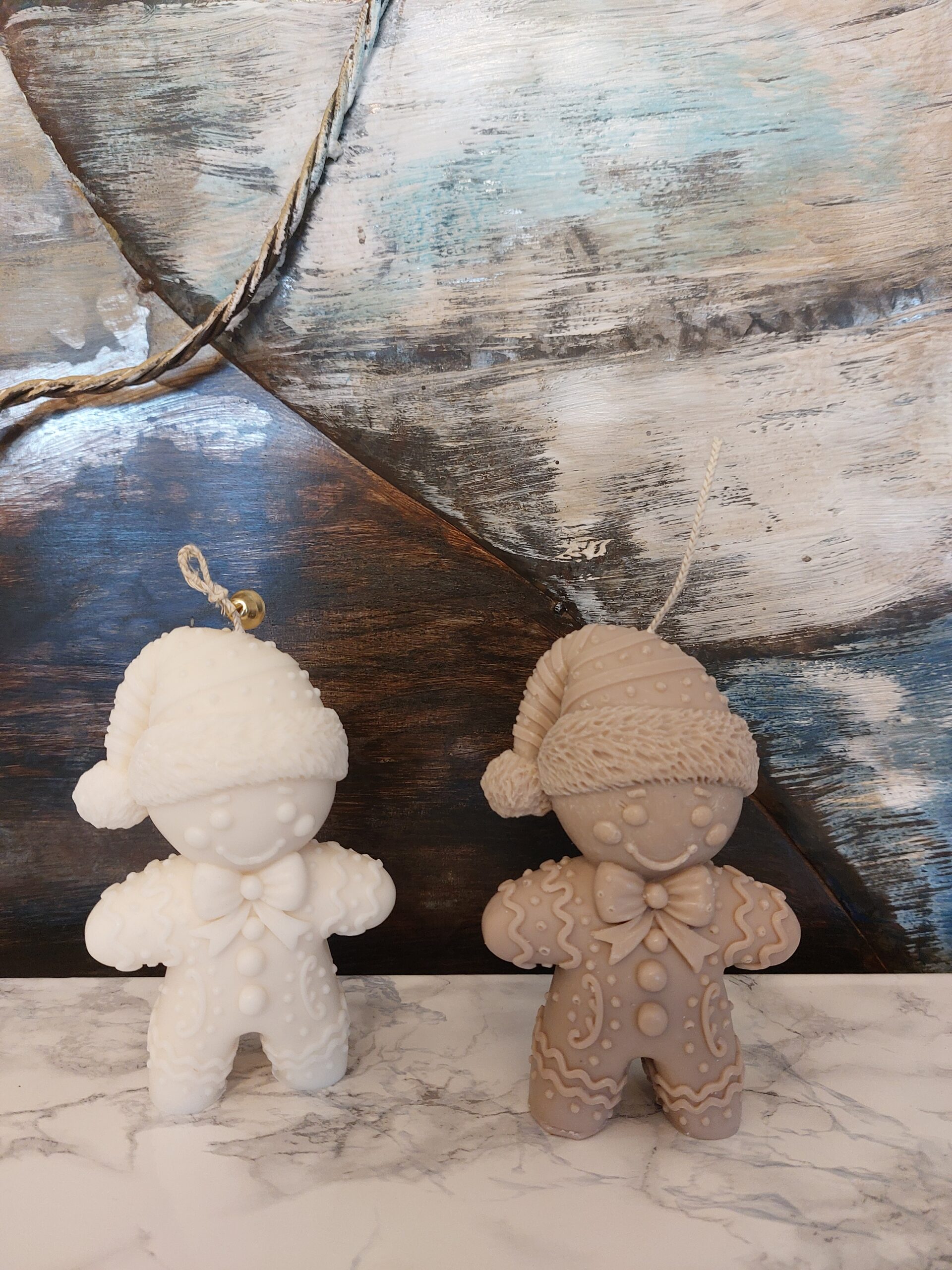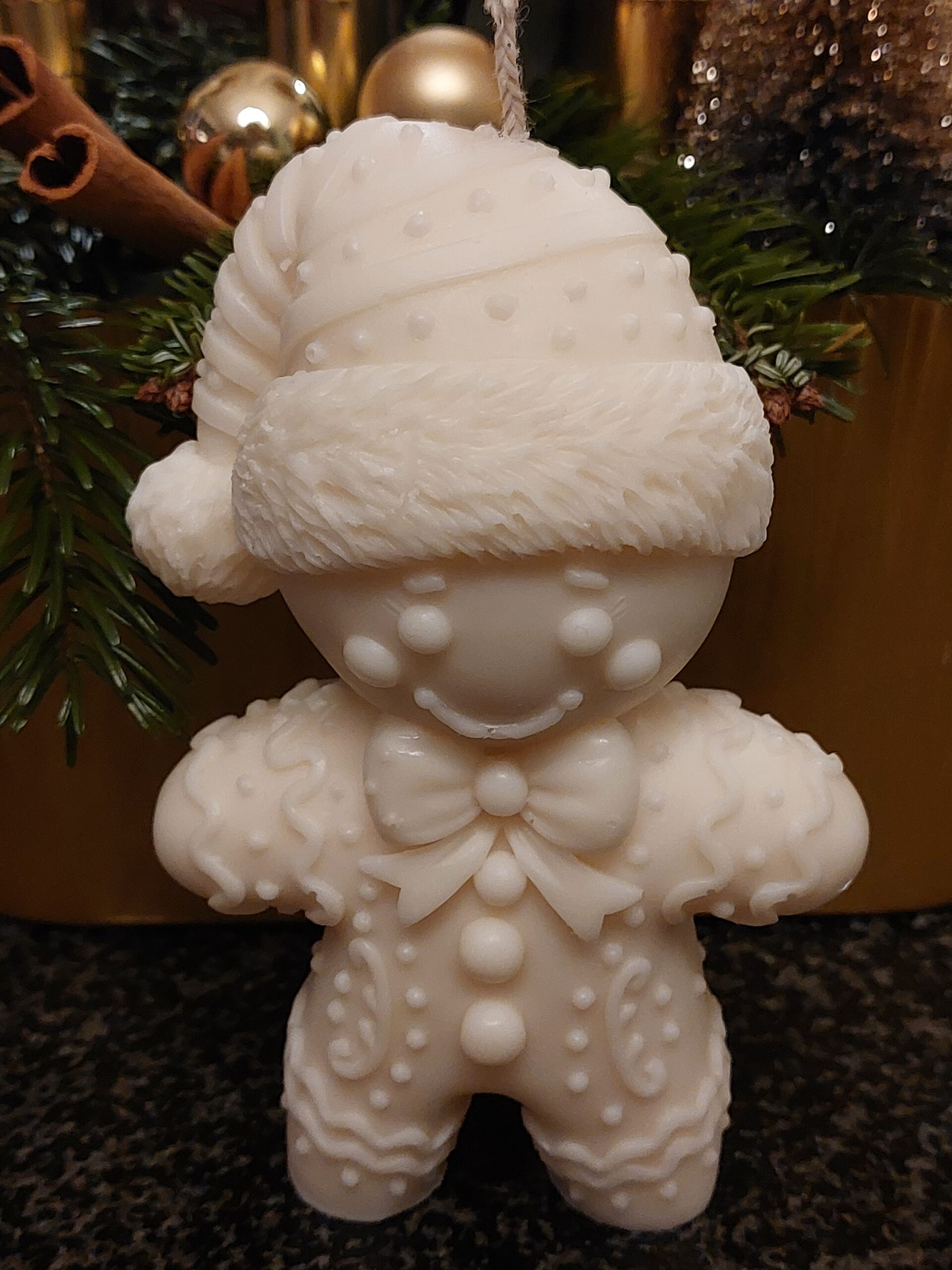 Bougie en forme de pain d'épices conçue avec amour, moulée à la main à partir de 100 % de cire de colza. Parfait pour une décoration de Noël chaleureuse ou comme cadeau charmant.