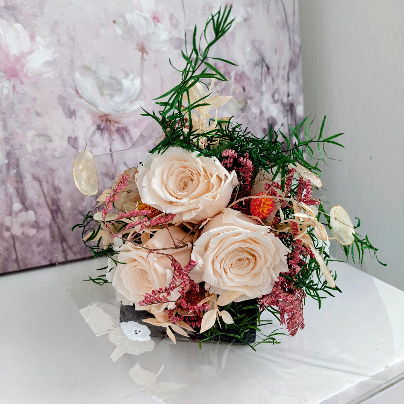 Beau bouquet de roses conservées champagne, 100 % naturelles et durables plusieurs années, accompagnées de fleurs séchées conservées et de plantes vertes.
