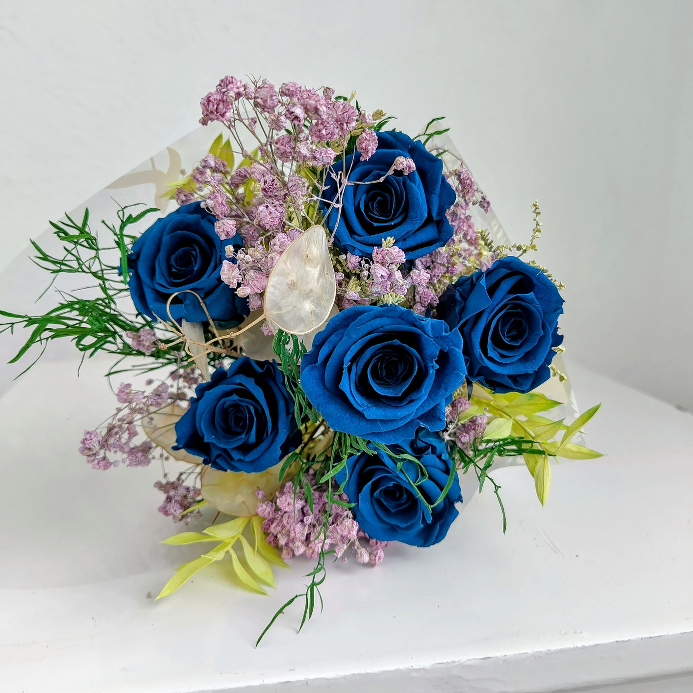 Beau bouquet de roses bleues 100 % naturelles et conservées pendant plusieurs années, accompagnées de fleurs séchées conservées et de plantes vertes.