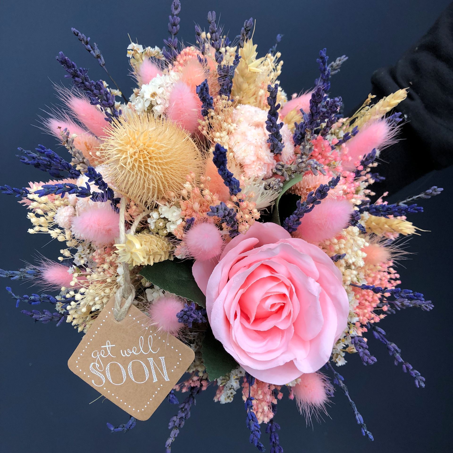 Découvre ce ravissant bouquet de fleurs séchées avec une rose textile et un charmant pendentif avec un tendre message ! Ce petit ajout ajoute une touche spéciale à ton cadeau et en fait un cadeau parfait pour cette occasion particulière.