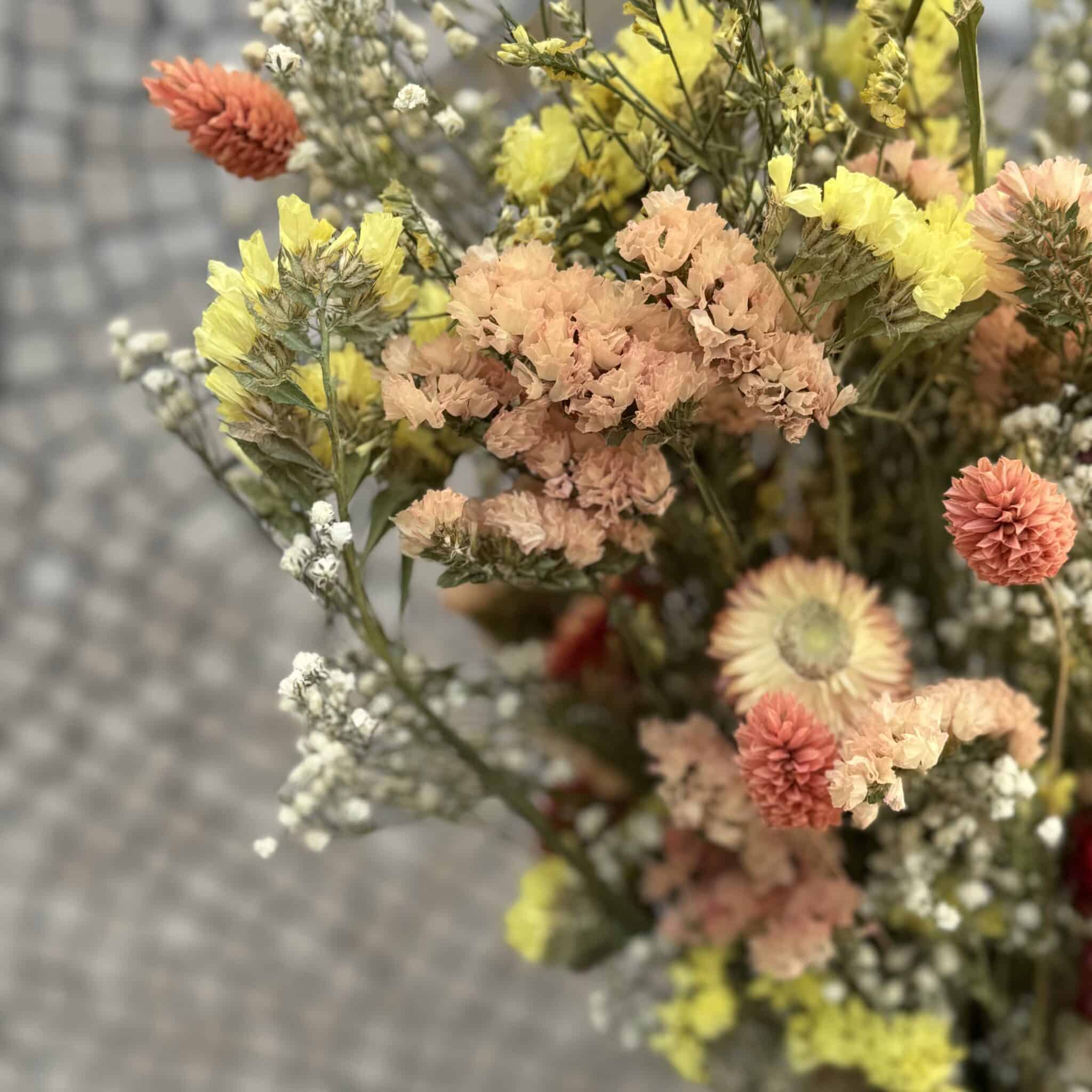 Délicatement. Intemporelle. Plein de charme. Bouquet de fleurs séchées 'Wollishofen' lié à la main dans des tons doux de jaune, orange et naturel