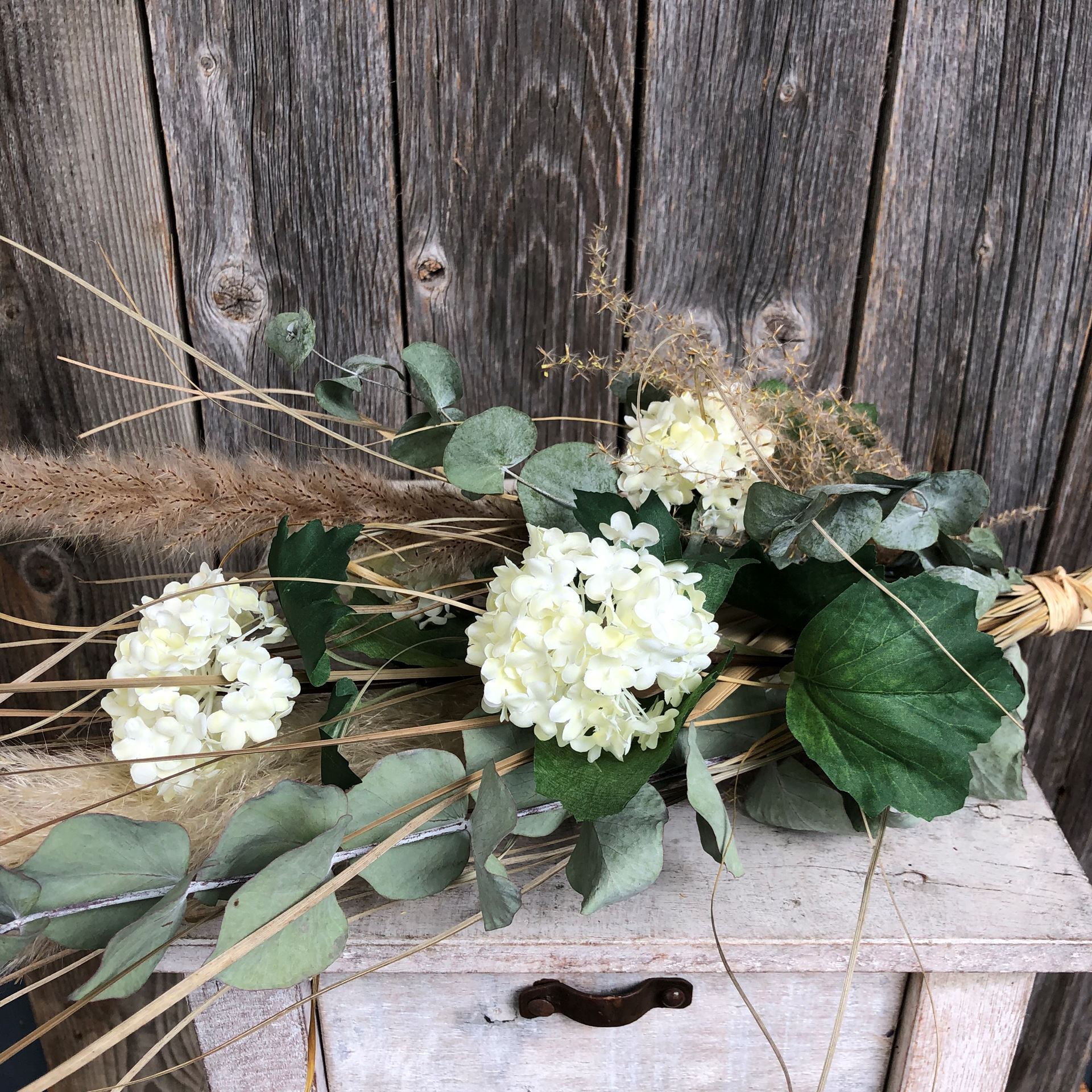 Découvre la beauté intemporelle de la nature dans notre bouquet de fleurs séchées, avec une combinaison harmonieuse d'eucalyptus tendance, d'herbe de la pampa délicatement séchée et de boules de neige aériennes en fleurs textiles de haute qualité. Longueur d'environ 70 cm / largeur d'environ 20 cm