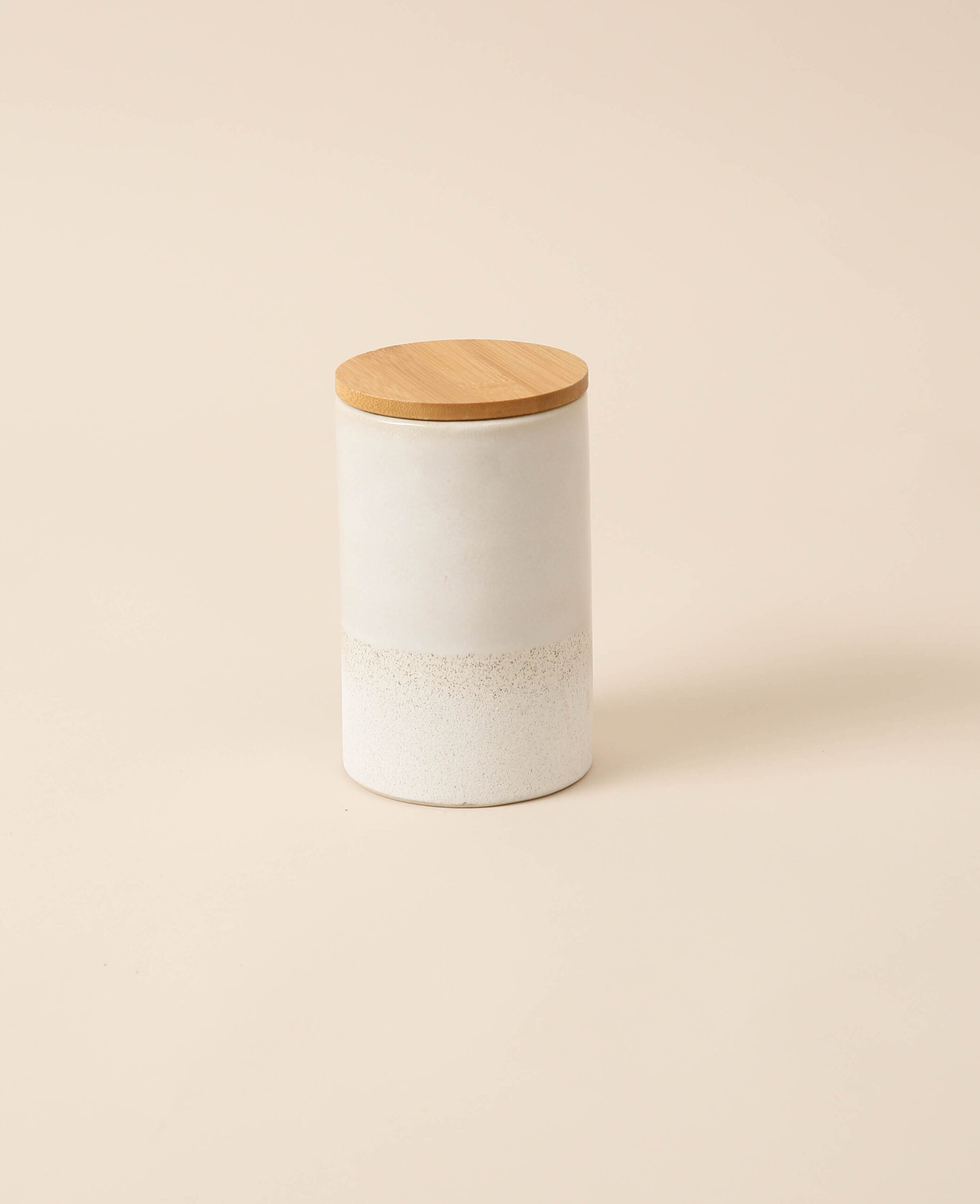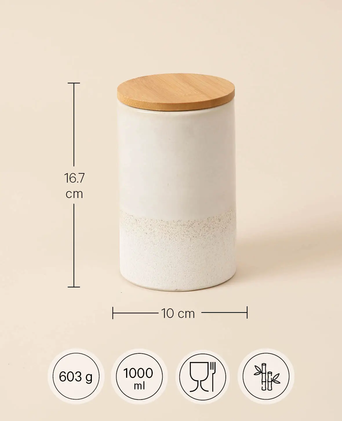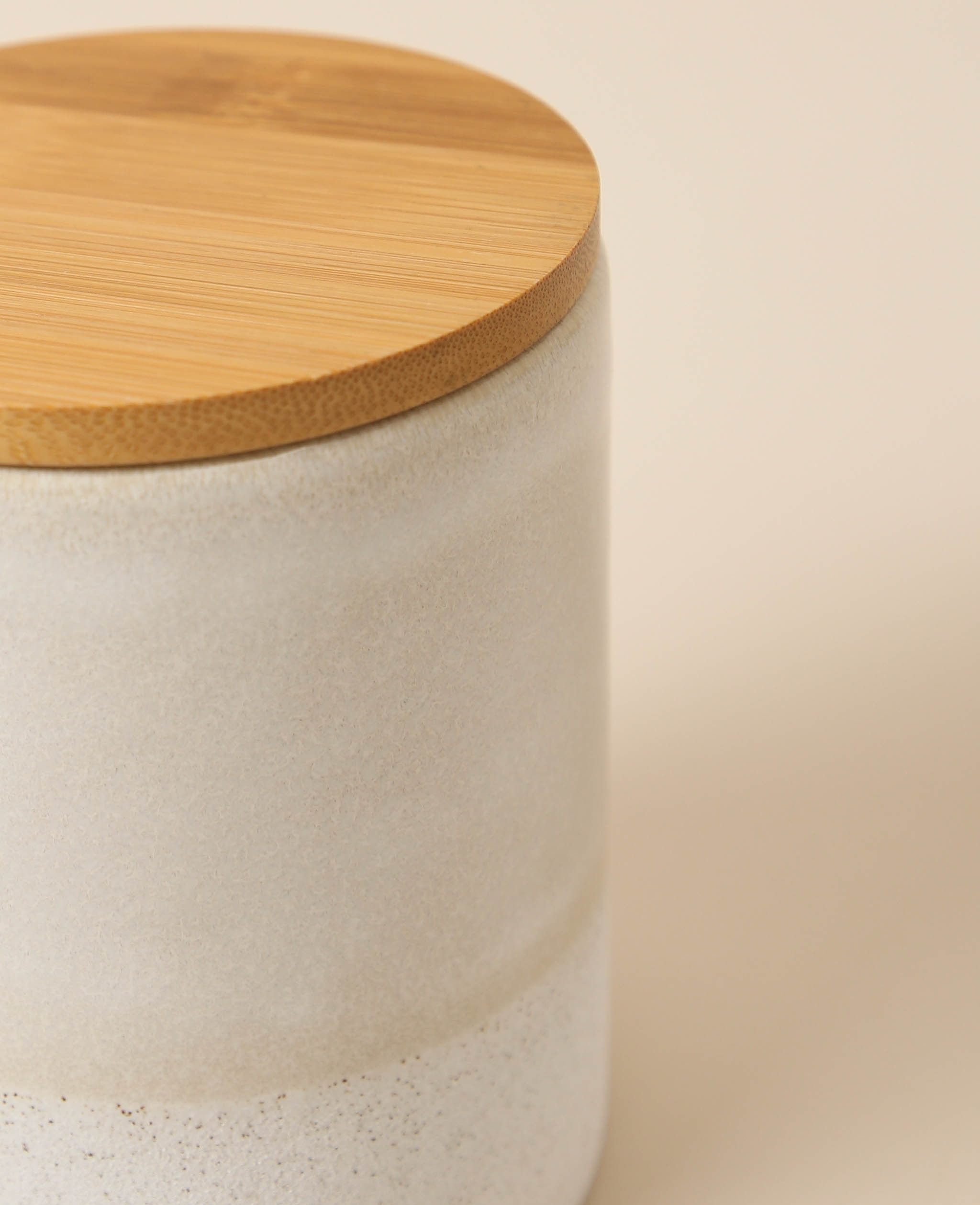 Boîte ronde en faïence avec émail beige et couvercle en bambou, 1 L, H 16.7 x Ø 10 cm
