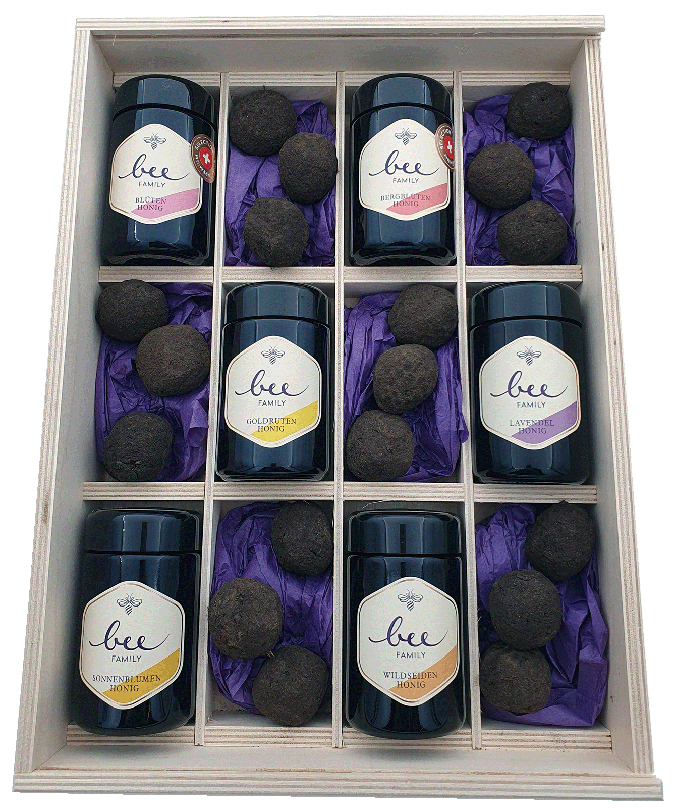 Dans cet ensemble, nous combinons la protection des abeilles et le plaisir du miel d'une manière unique. Notre doux trésor dans notre boîte en bois véritable Bee-Family n'enthousiasme pas seulement par la "nourriture pour abeilles" qu'il contient (boules de graines), mais aussi par un beau mélange de variétés de miel les plus fines. Les boules de graines sont de petites boules de terre, d'argile et de graines. Tu peux soit planter les boules de graines, soit les lancer, les rouler ou les poser tout simplement sur la terre. La prochaine pluie ramollit la boule et active les graines qui commencent alors à germer et permettent de nouvelles sources de nourriture pour les abeilles. Découvre un extrait de la fascinante variété de saveurs de notre gamme de miel et offre de la nourriture à nos abeilles.