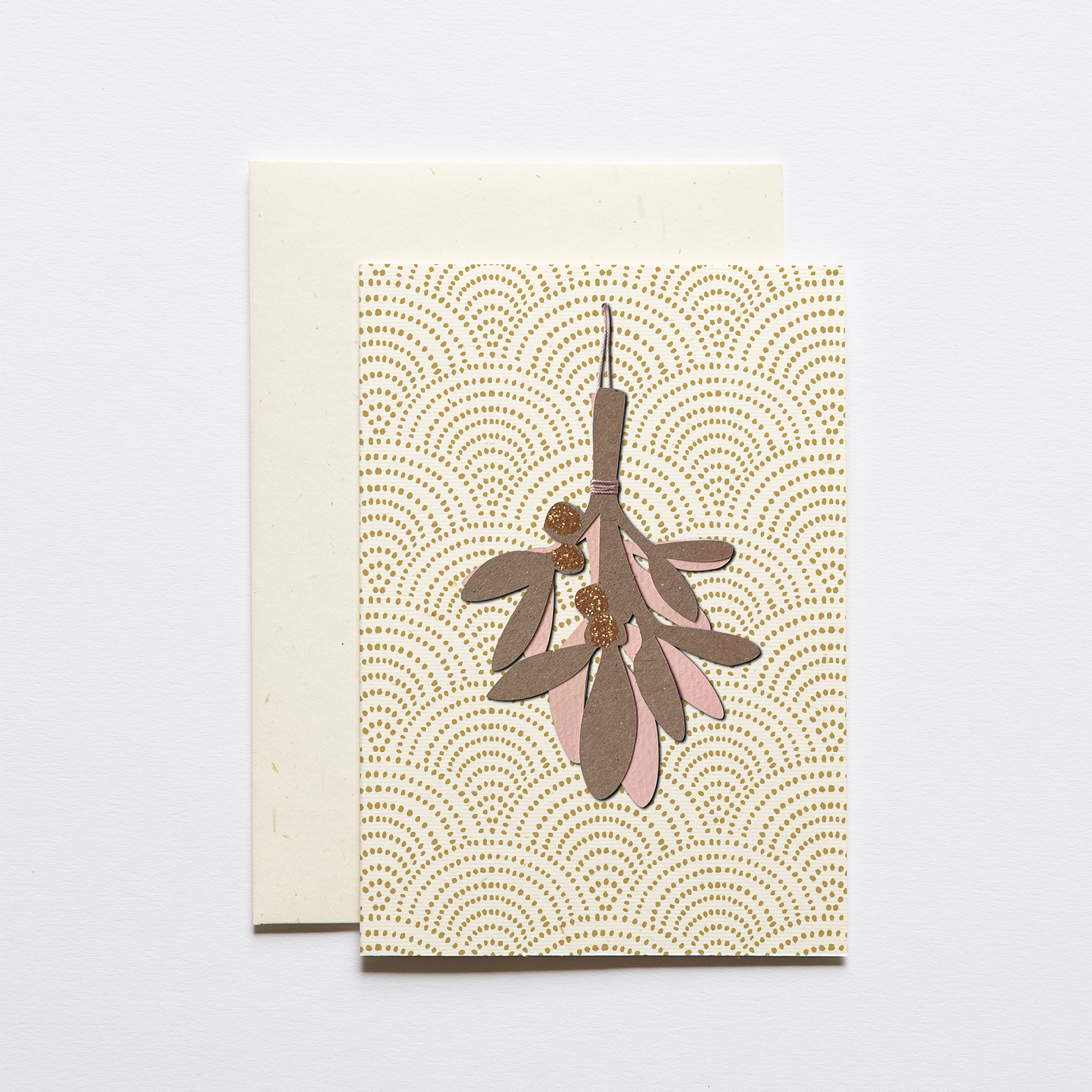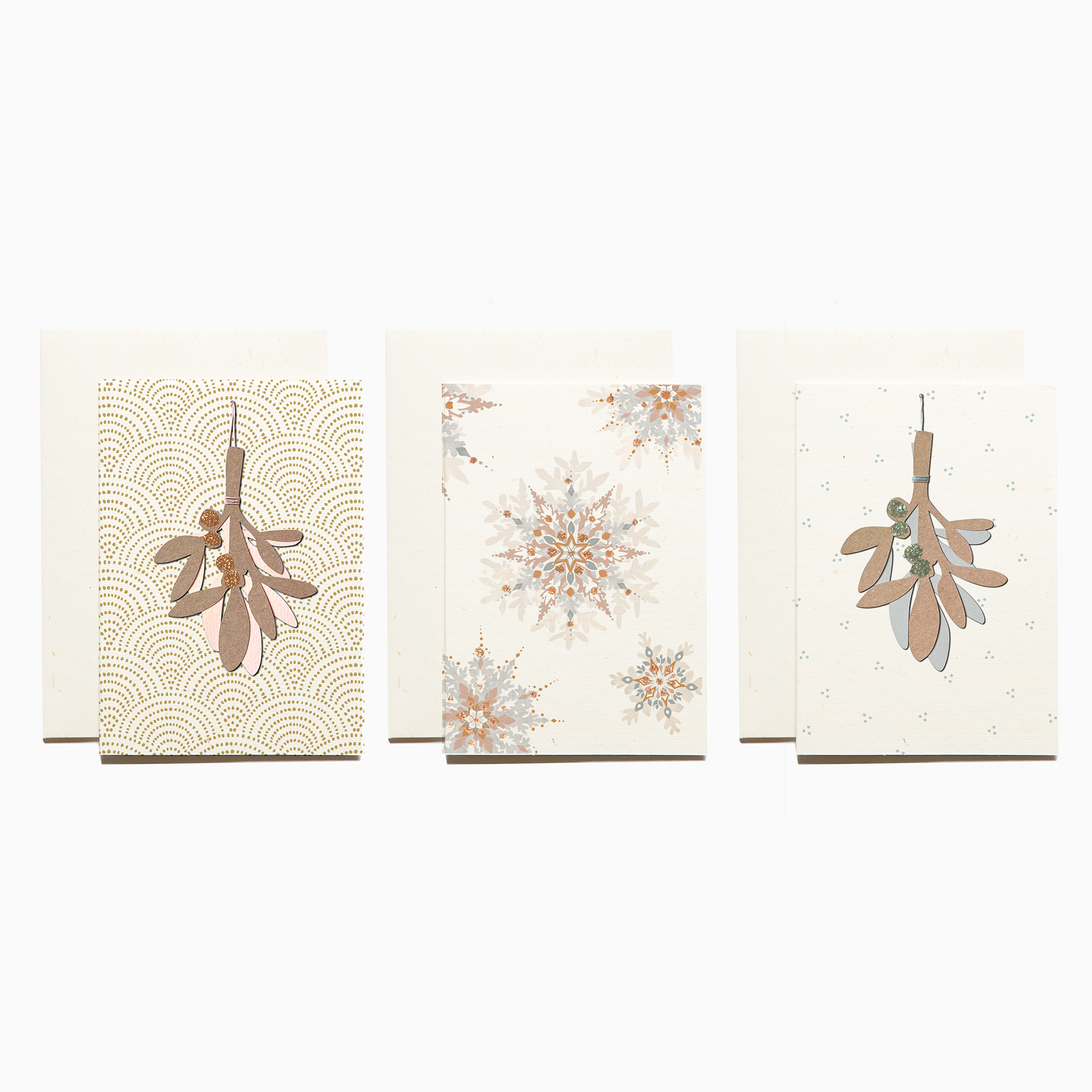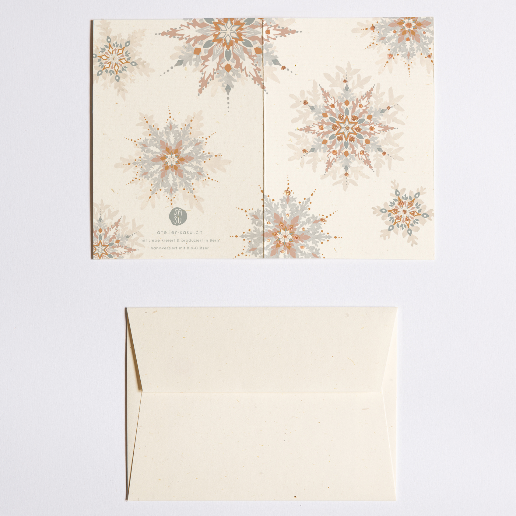 3 cartes pliables avec enveloppe et feuille d'insertion . Décoré à la main avec des paillettes bio.