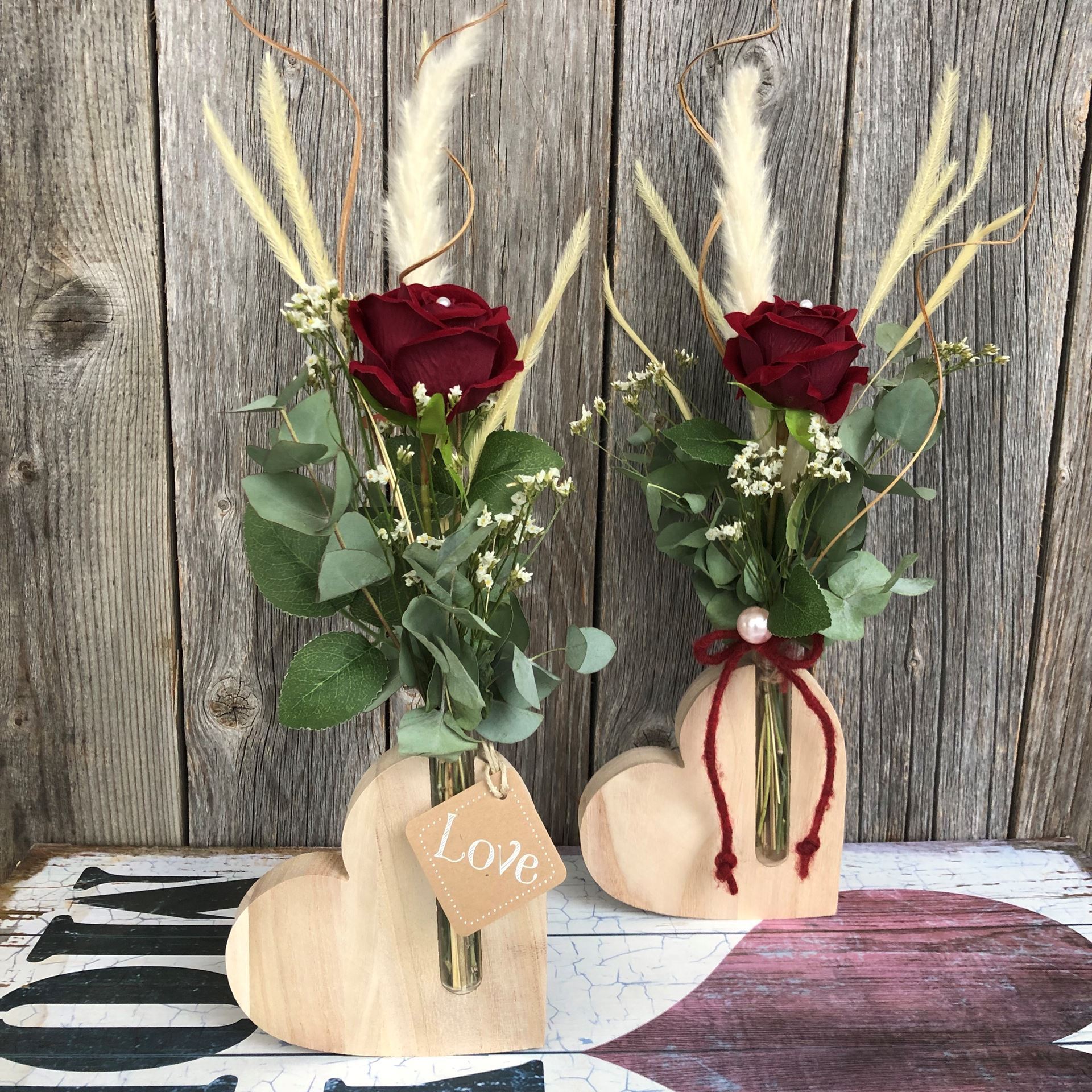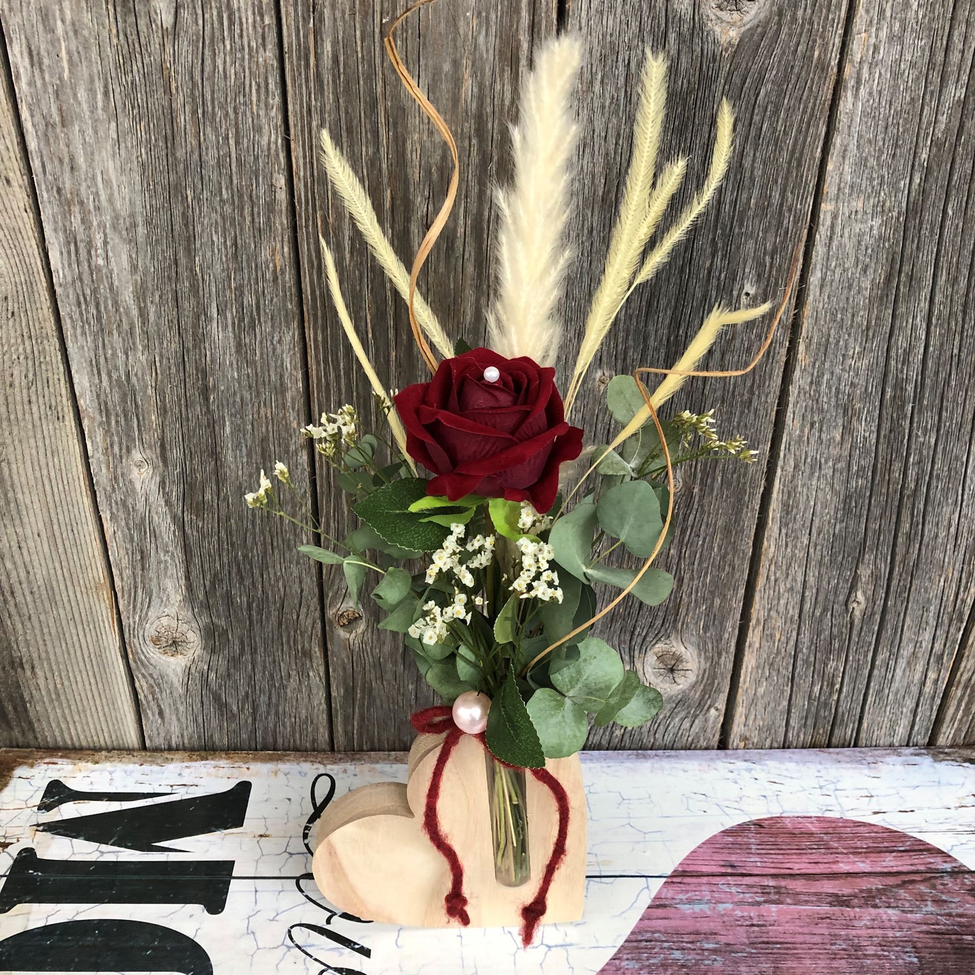 Déco adorable avec un cœur en bois incluant une rose textile rouge, des fleurs séchées et un pendentif "Love". Ce cœur en bois avec sa décoration unique n'est pas seulement un objet de décoration, mais aussi une expression de sentiment et de dévotion. Parfait comme cadeau pour les occasions spéciales.