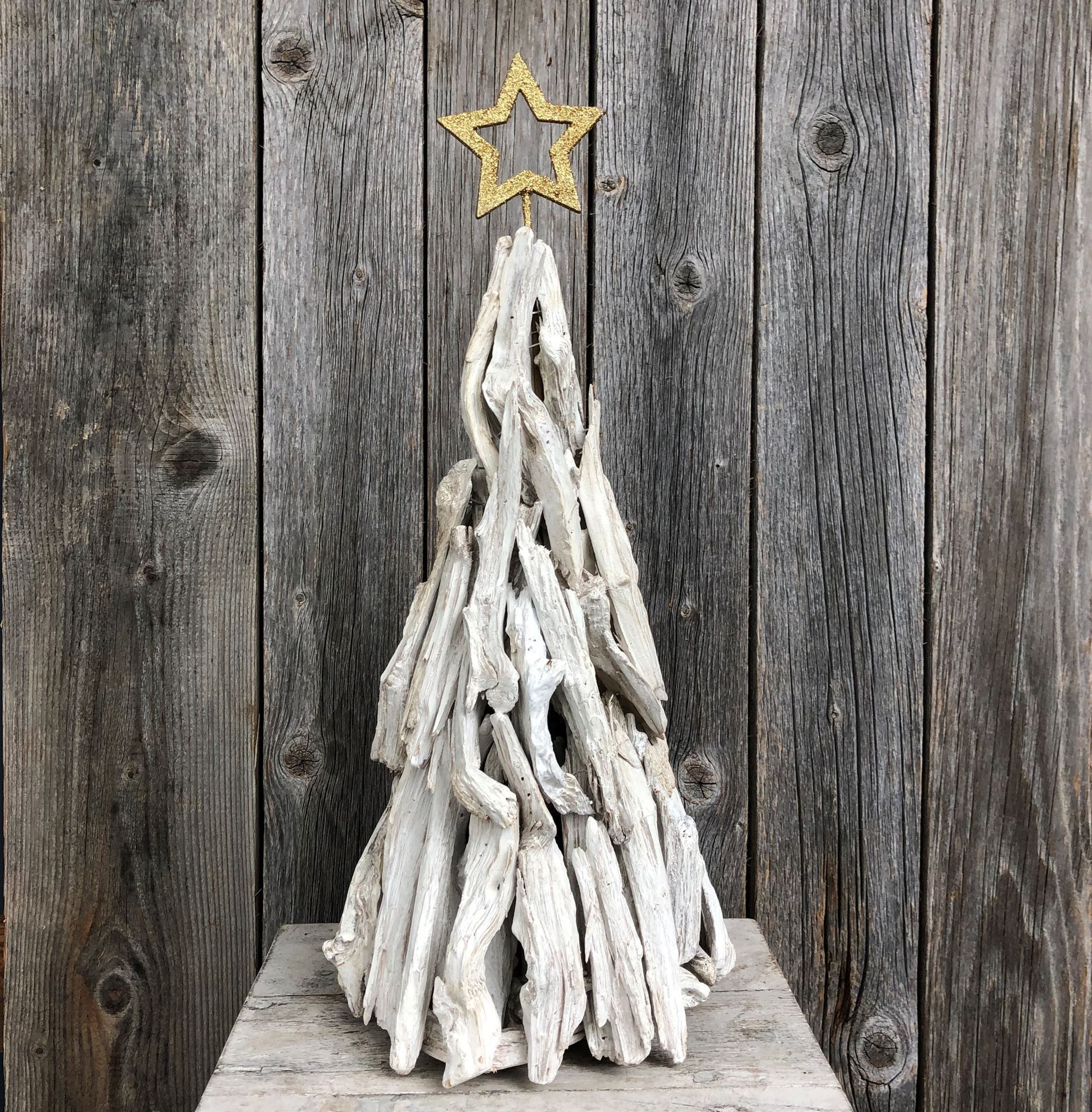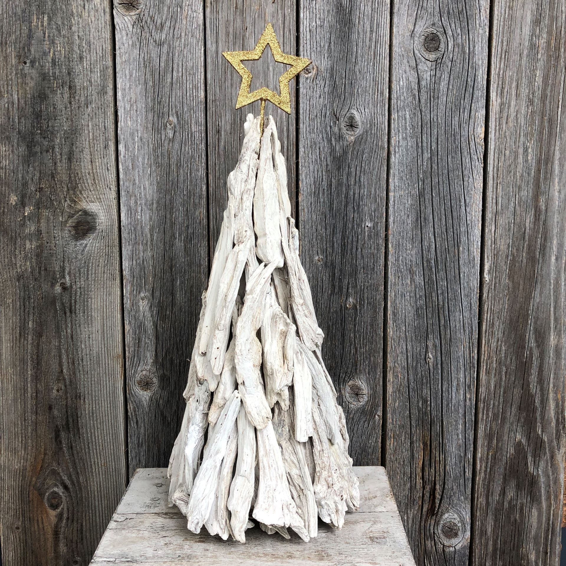 Découvre la beauté enchanteresse de nos sapins de Noël en bois flotté - ennoblis d'une ravissante peinture blanche et d'une étoile festive aux couleurs dorées et luminescentes. Hauteur environ 45cm, ⌀ fond environ 20cm.