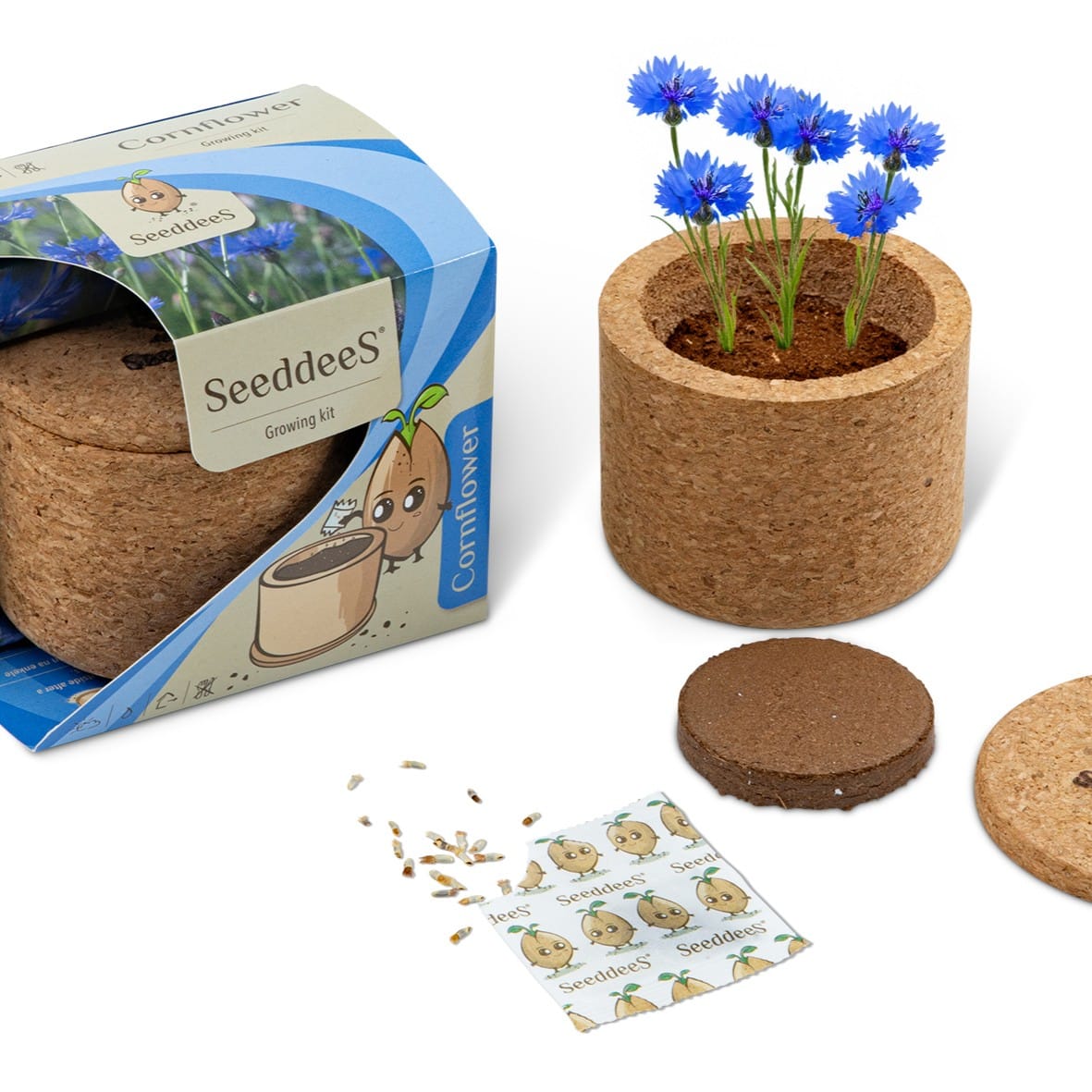 CONTIENT : Jardinière en liège avec soucoupe / couvercle en liège avec plaquette de coco et graines de bleuet.
