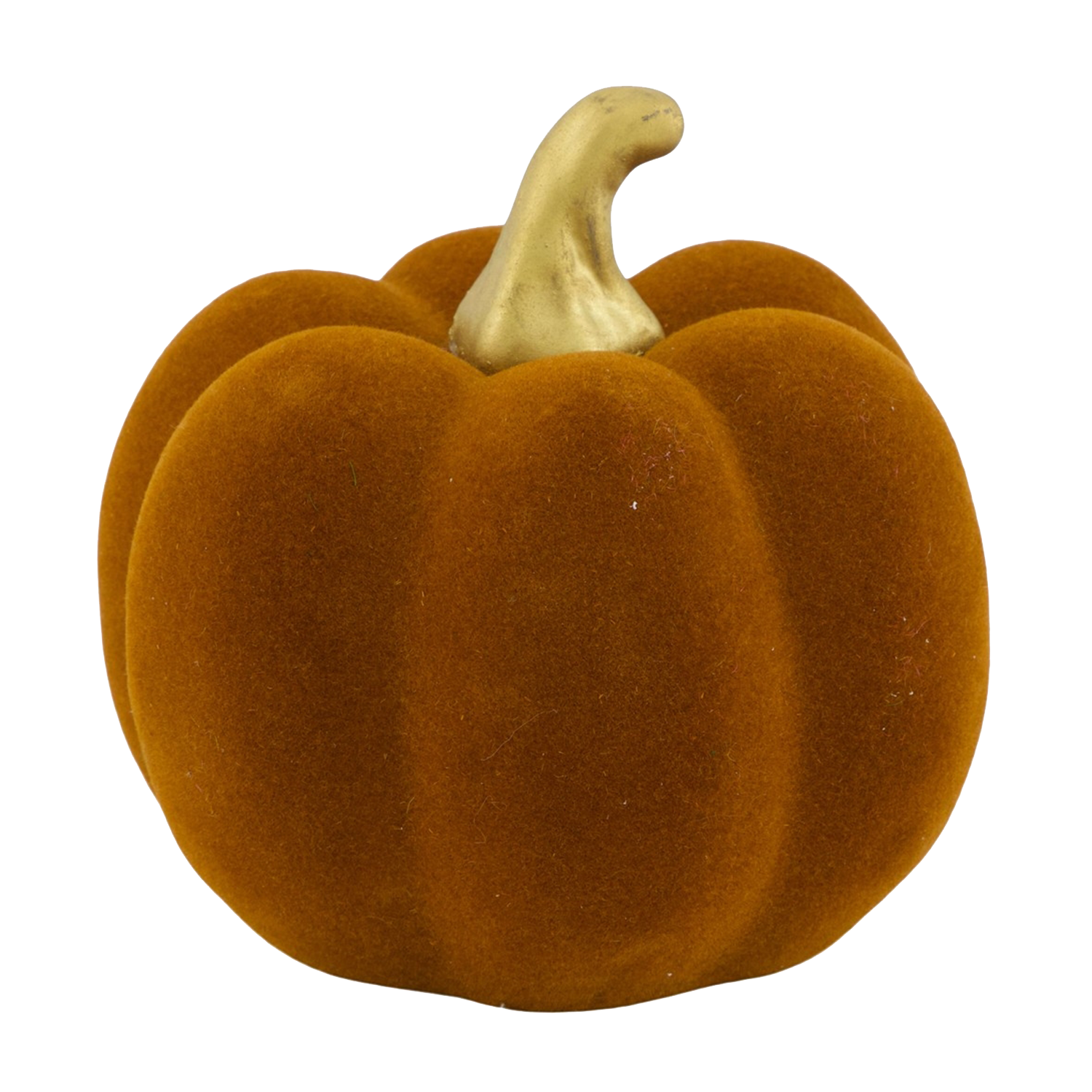 Citrouille décorative au design automnal : la surface douce et veloutée d'un orange chaud est complétée avec raffinement par une tige dorée. Parfait pour des décorations d'automne et d'Halloween élégantes. Idéal comme décoration de table ou pour des compositions saisonnières.