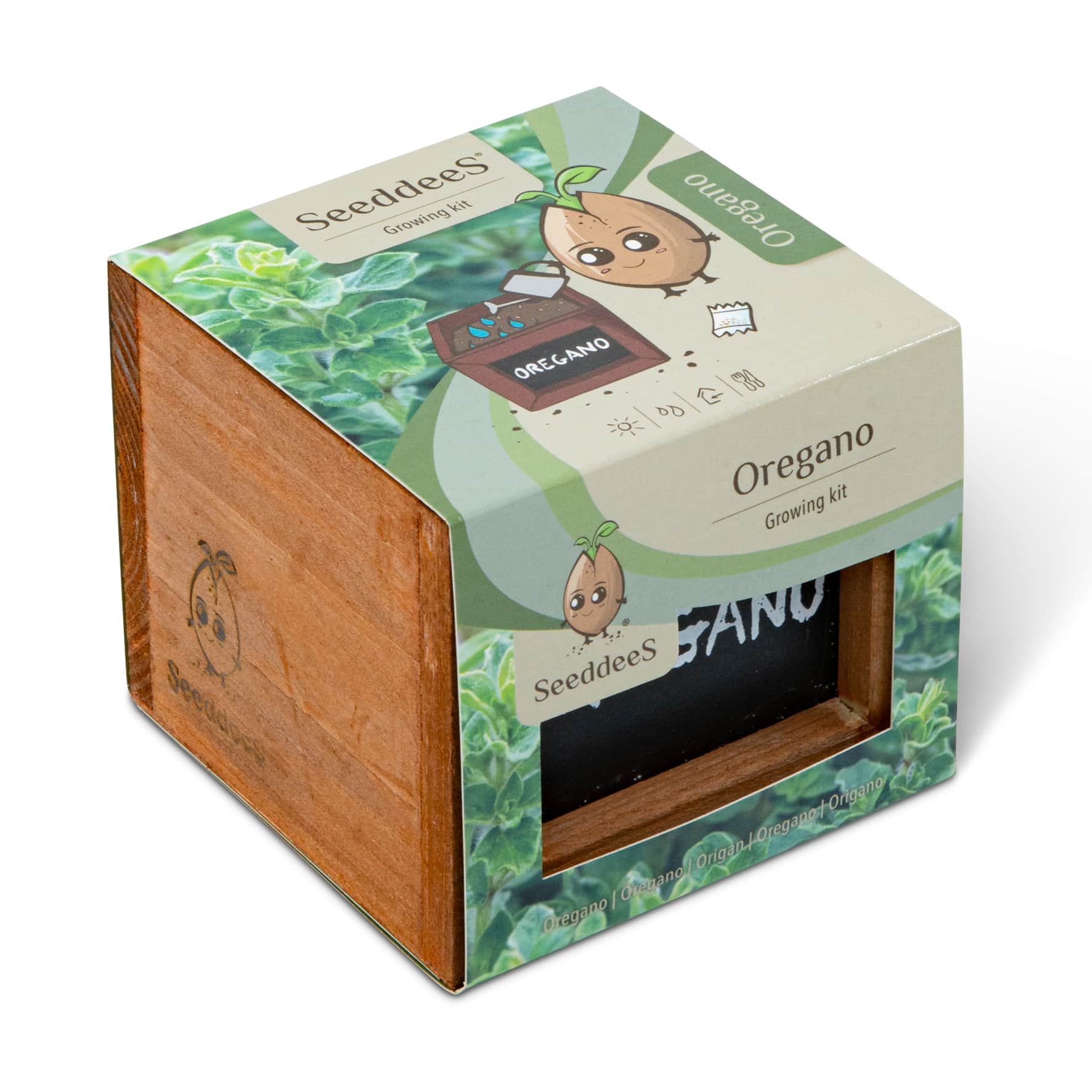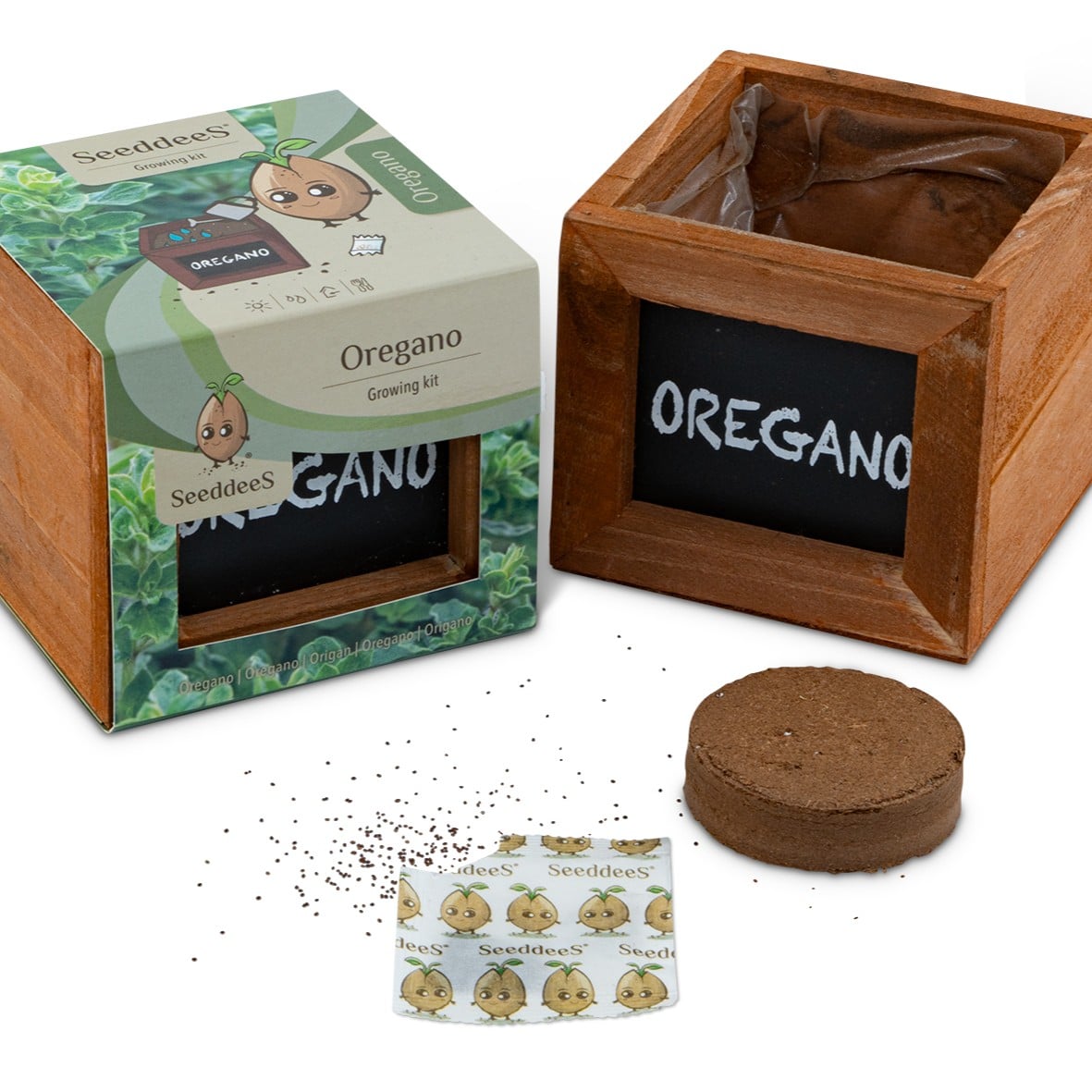 CONTIENT : des cubes en bois avec une plaquette de coco et des graines d'origan.