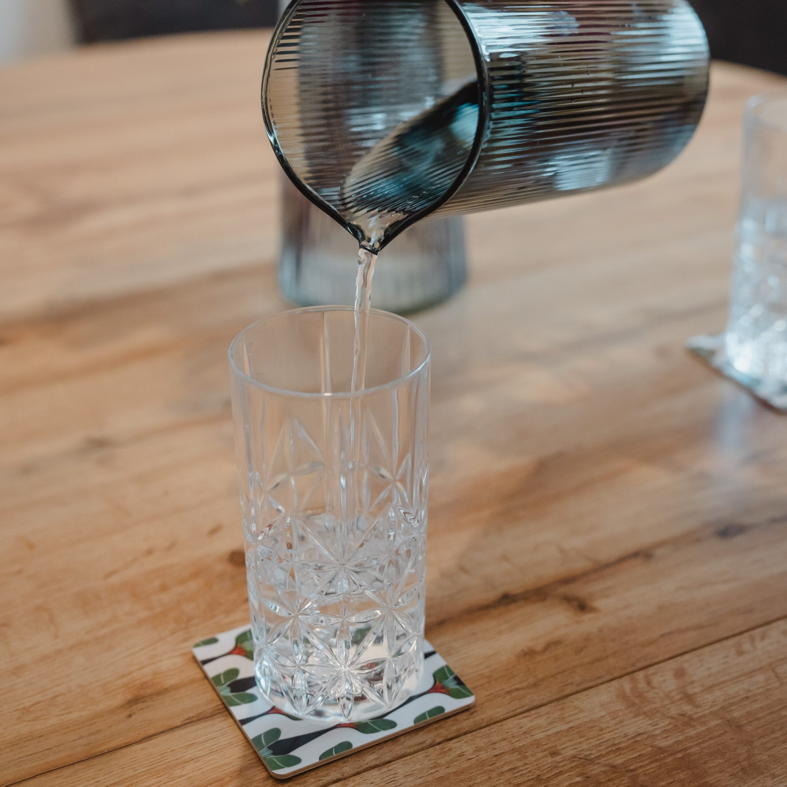 Dessous de verre de haute qualité en placage de bouleau durable avec un design vivant en édition limitée. Conçu en Suisse, fabriqué à la main en Suède. Lot de 4, 9 x 9 cm.