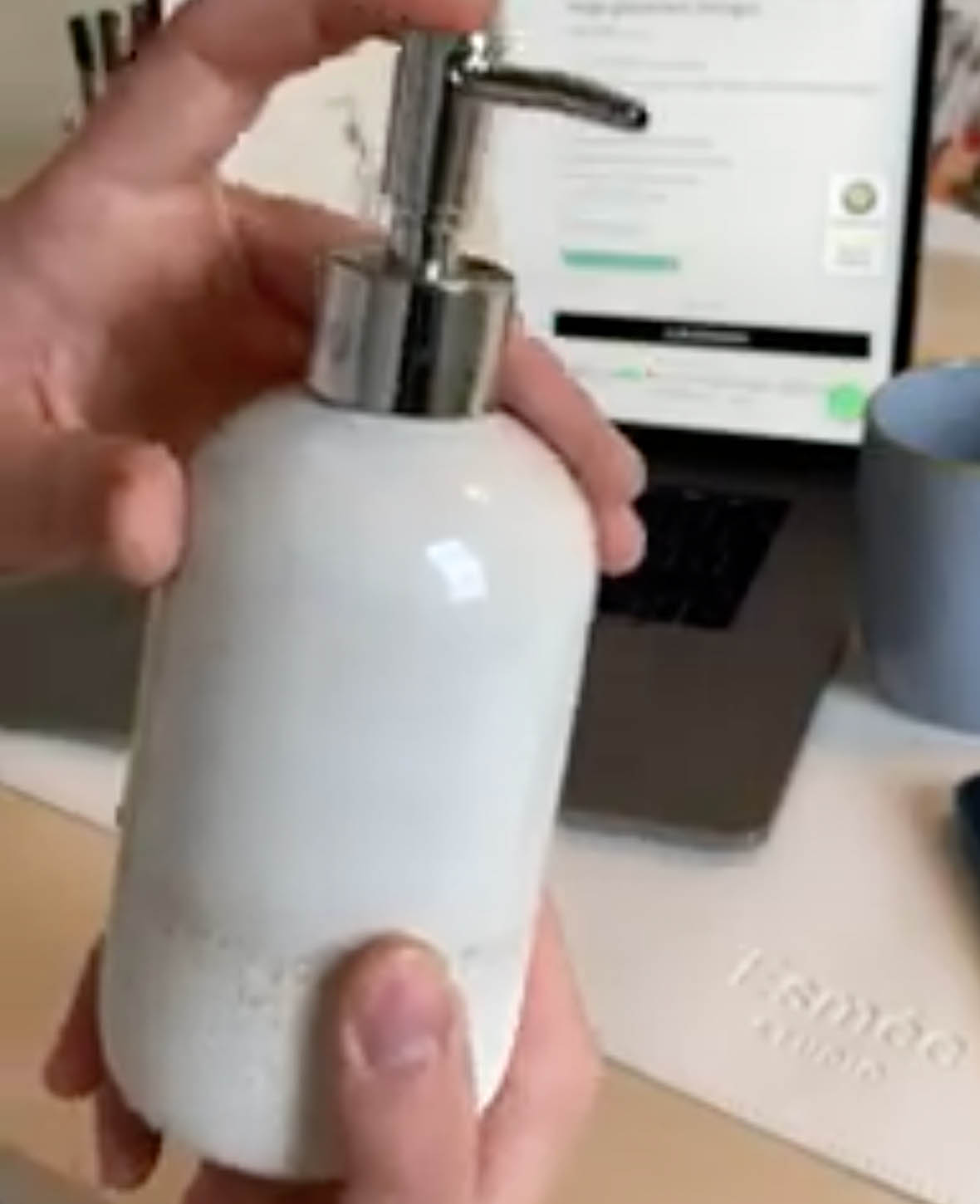 Elégant distributeur de savon dans un beau beige avec une finition rugueuse et un distributeur en plastique de haute qualité. Se dévisse facilement et se remplit à nouveau. S'intègre à merveille dans la cuisine et la salle de bain.