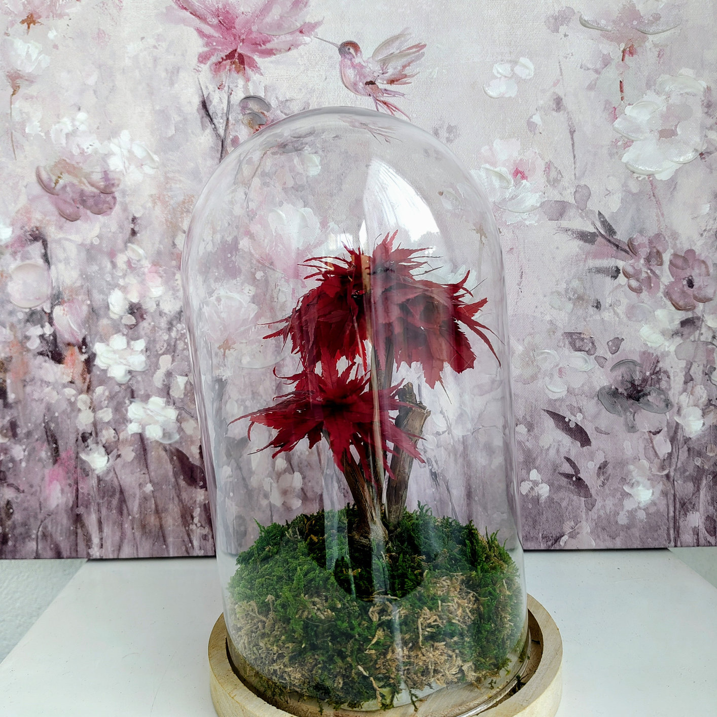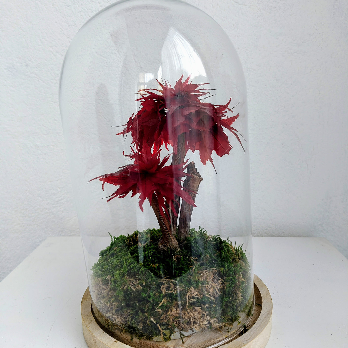 Bonsaï en érable stabilisé sous cloche de verre, pièce unique.