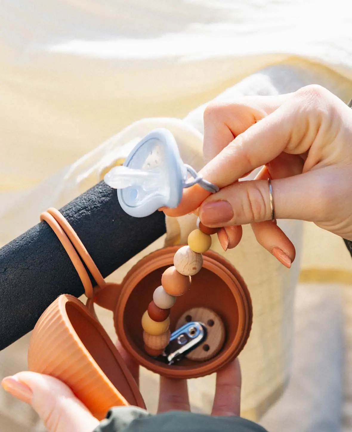 Ton compagnon indispensable pour les voyages : notre élégant étui à sucettes en rouge rouille chaud. Cet étui pratique n'est pas seulement un accessoire de mode, il est aussi extrêmement pratique. Il garde toutes les tétines en sécurité et à portée de main pour que tu puisses toujours te concentrer sur le plus important - les besoins de ton bébé. Plus jamais de soucis que la sucette se perde ou se salisse. La fixation facile à la poussette la rend indispensable pour chaque sortie.
