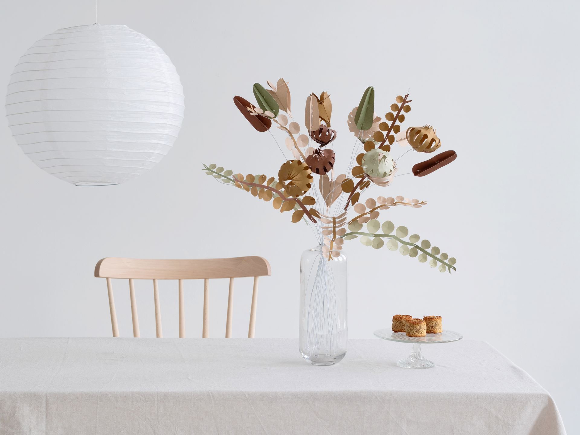 Pour ce bouquet de fleurs ou pour une belle couronne, tu n'as besoin que du contenu de ce kit. Il n'y a rien à couper, rien à coller, tout est prédécoupé et incisé et les tiges des fleurs - le fil - sont déjà incluses. Coupe le fil de fer pour fleurs à la longueur souhaitée, enfile-le dans les fentes prédécoupées et compose toi-même ton bouquet. Sur les photos, tu peux voir deux bouquets : l'un avec 2 sets de FIELD et l'autre, beau et discret, avec 1 set de FIELD. Même détachées - en tant que fleur unique dans un vase - les fleurs attirent discrètement l'attention dans ton salon.