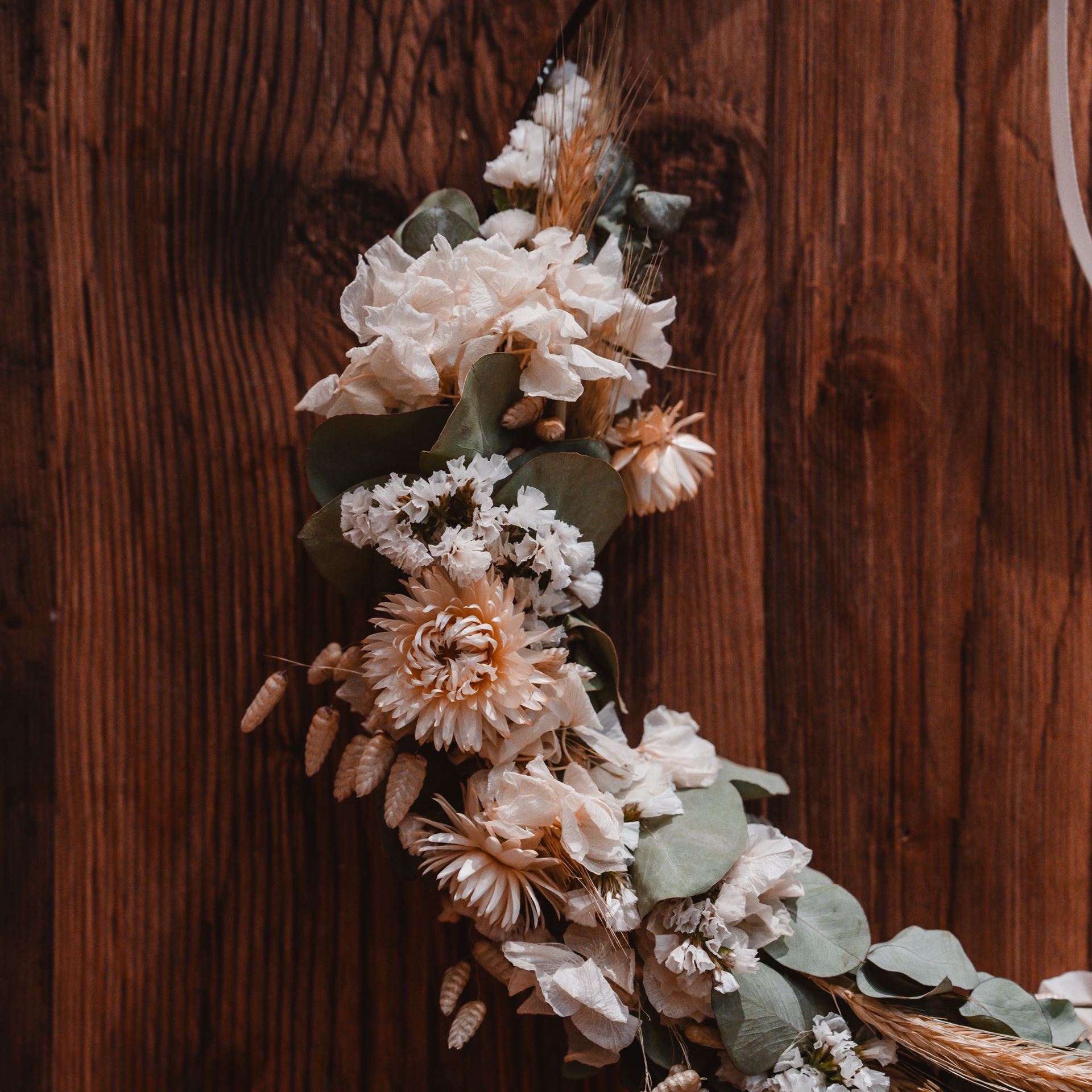 Indications pour Flower Loop : Ø environ 40 cm, avec des hortensias stabilisés, des eucalyptus, des fleurs de paille, des épis, etc.
