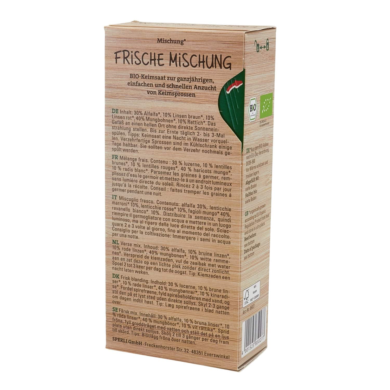 Contenu : 30% luzerne*, 10% lentilles brunes*, 10% lentilles rouges*, 40% haricots mungo*, 10% radis*. Placer le récipient dans un endroit clair, sans lumière directe du soleil. Rincer 2 à 3 fois par jour jusqu'à la récolte. Conseils : Faire tremper les graines germées une nuit dans l'eau. Les germes prêts à être consommés se conservent quelques jours au réfrigérateur. Elles doivent être rincées une nouvelle fois avant d'être consommées.