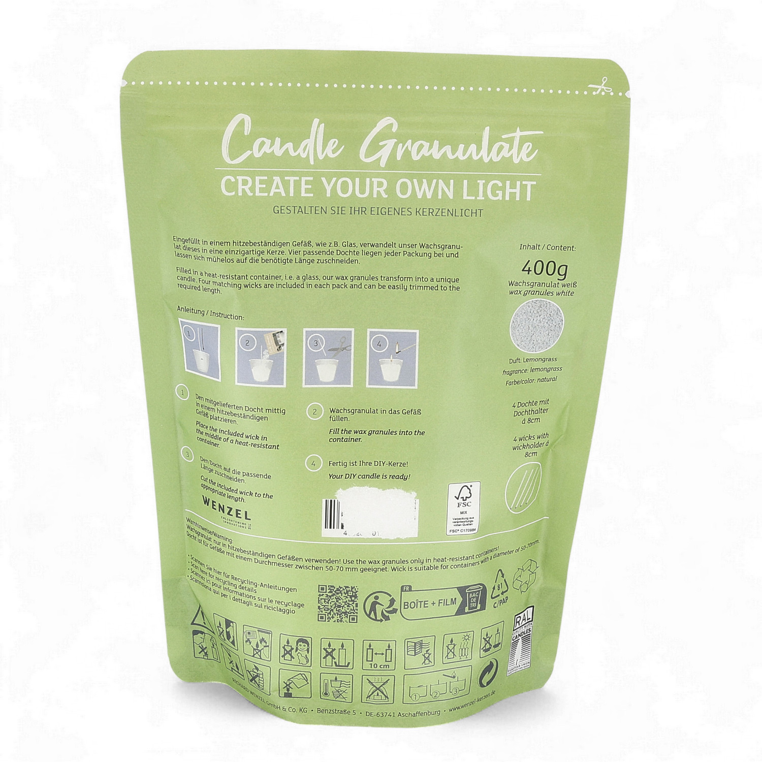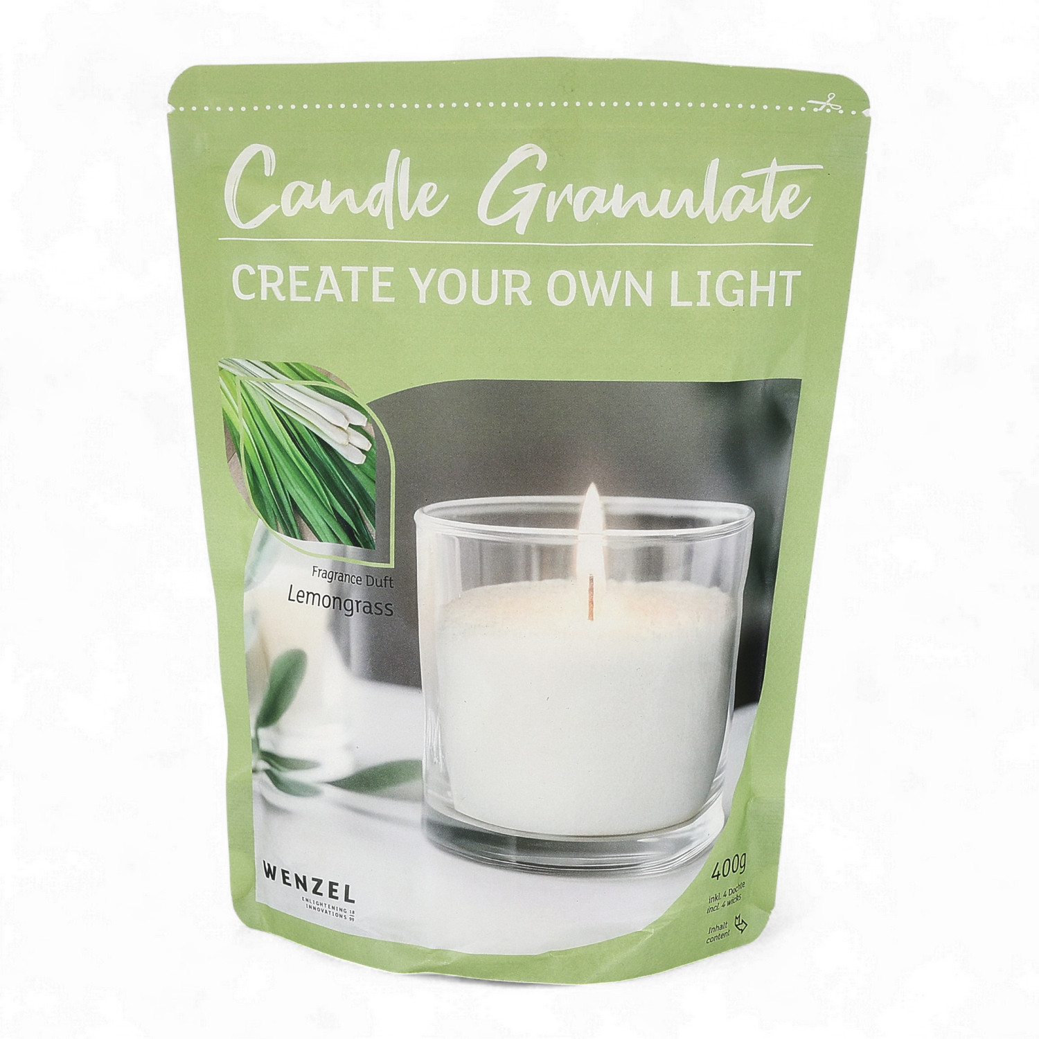 Chaque paquet contient 400 g de granulés de cire blanche ainsi que quatre mèches assorties qui peuvent être facilement coupées à la longueur souhaitée.