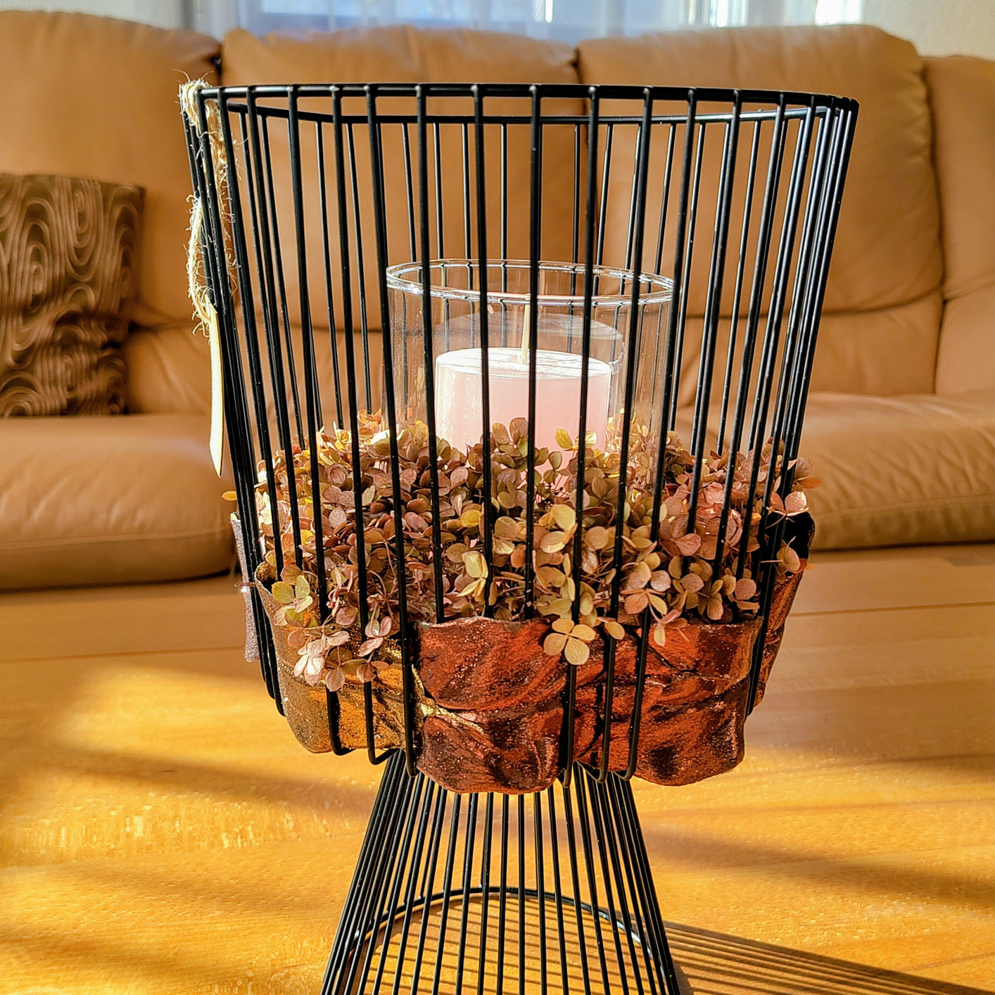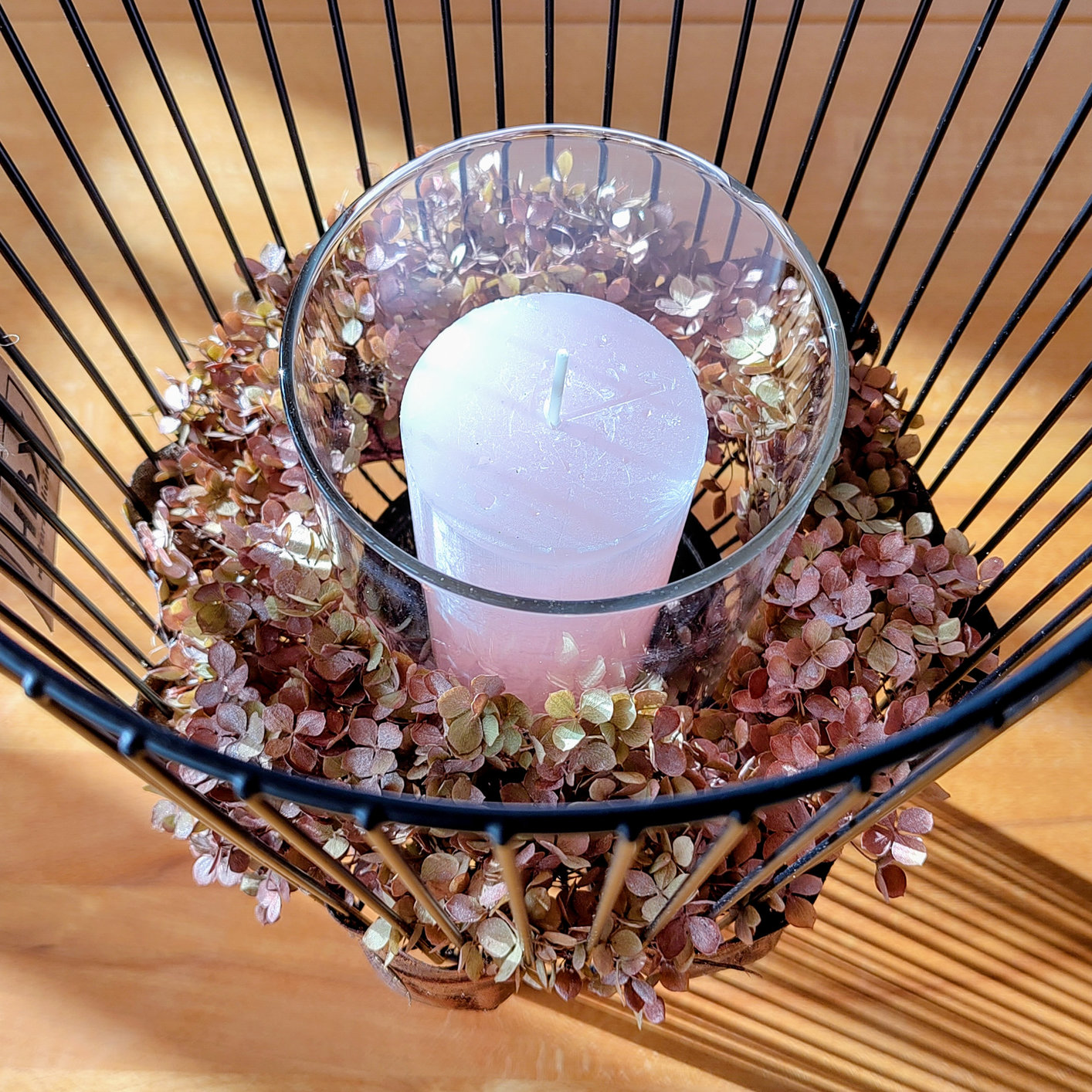 Cette décoration est un cadre métallique noir décoré d'hortensias séchés et de feuilles dorées artificielles. A l'intérieur se trouve un pied en verre avec une bougie. Cette décoration peut être conservée dans un endroit sec pendant un an. La bougie peut être remplacée à volonté.