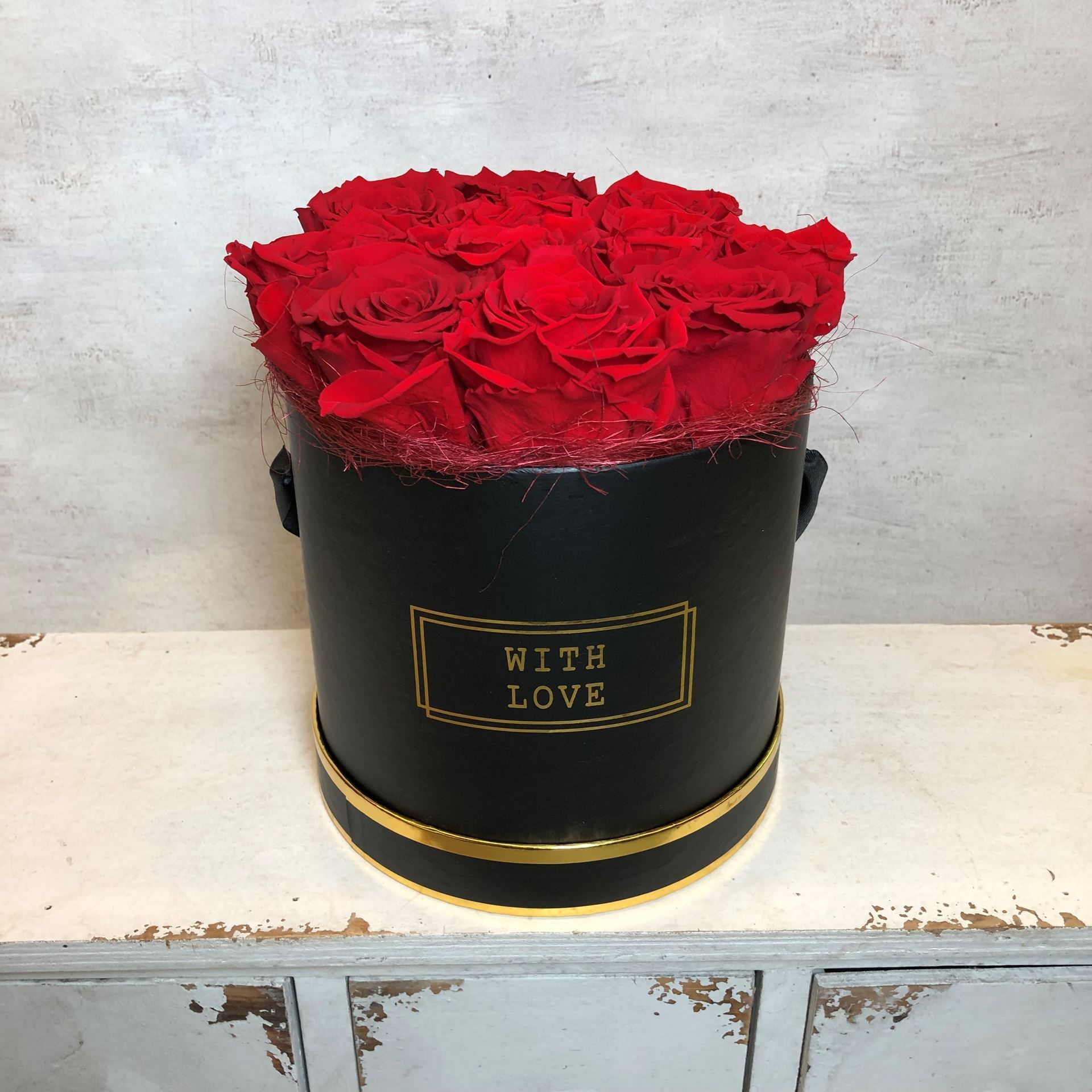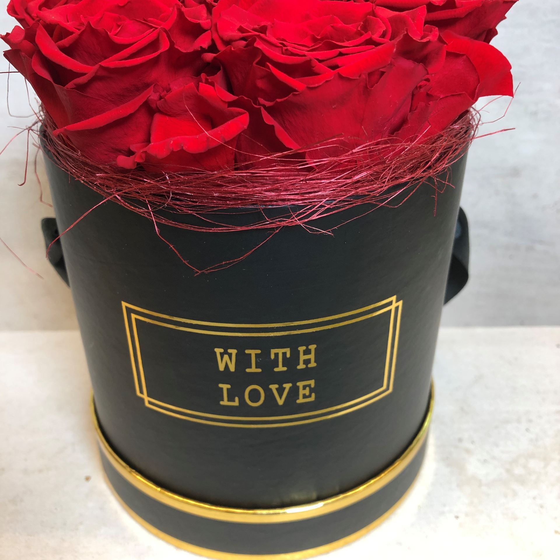 Magnifique boîte à roses ronde et noire avec inscription dorée "With Love "Ø environ 15cm avec 7 roses rouges stabilisées