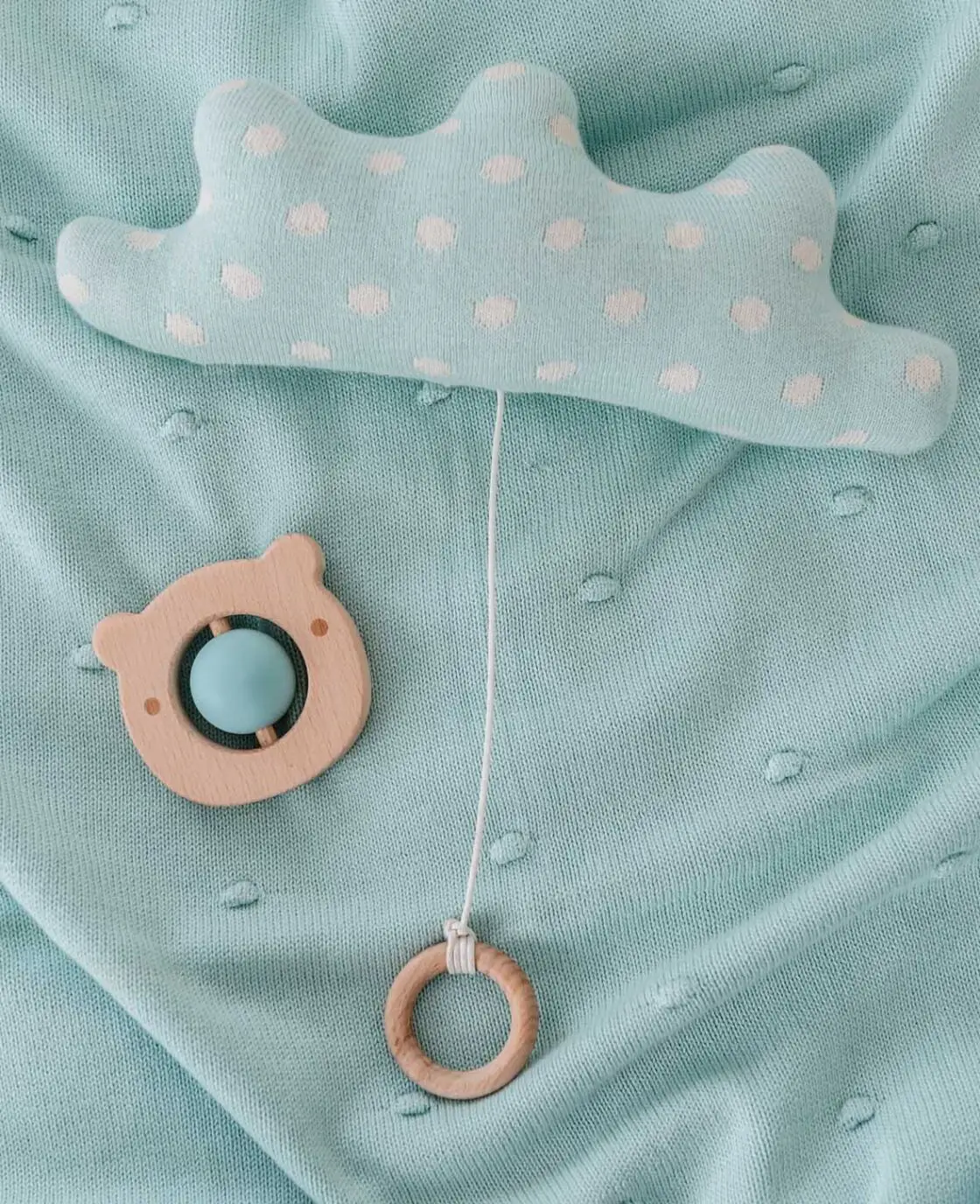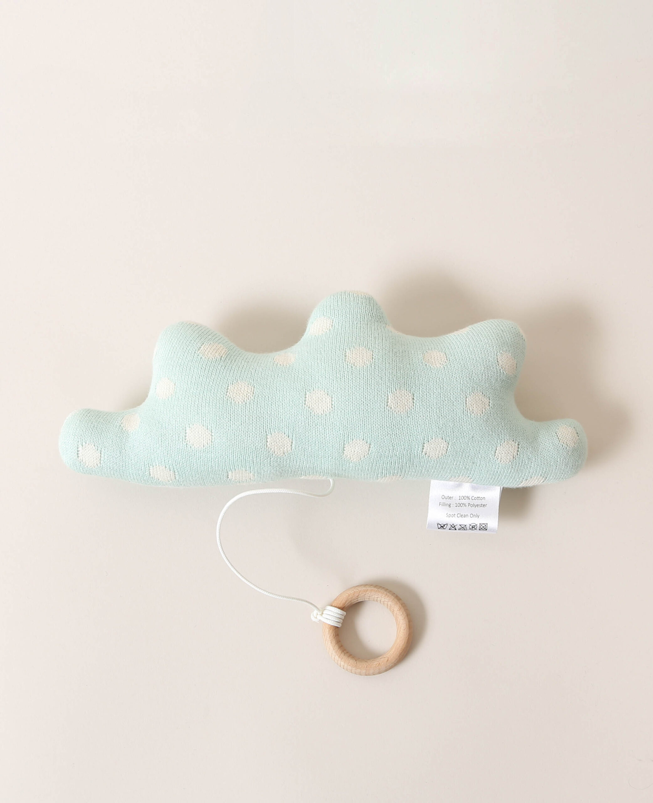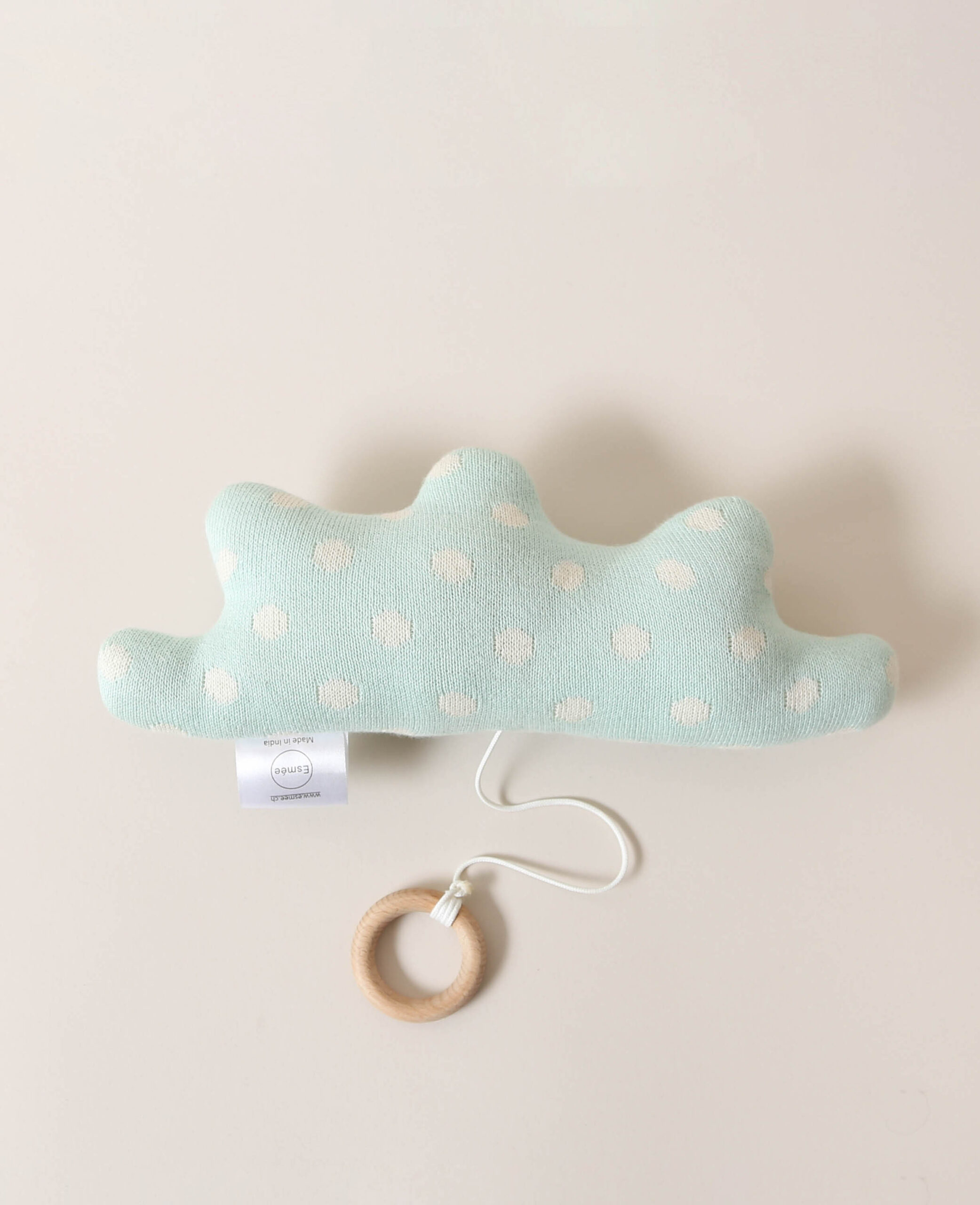 Boîte de jeu à remonter de couleur menthe, nuage en coton tricoté, qui joue la mélodie de la chanson pour enfants "Dors petit, dors" et accompagne ainsi doucement ton enfant vers le sommeil.