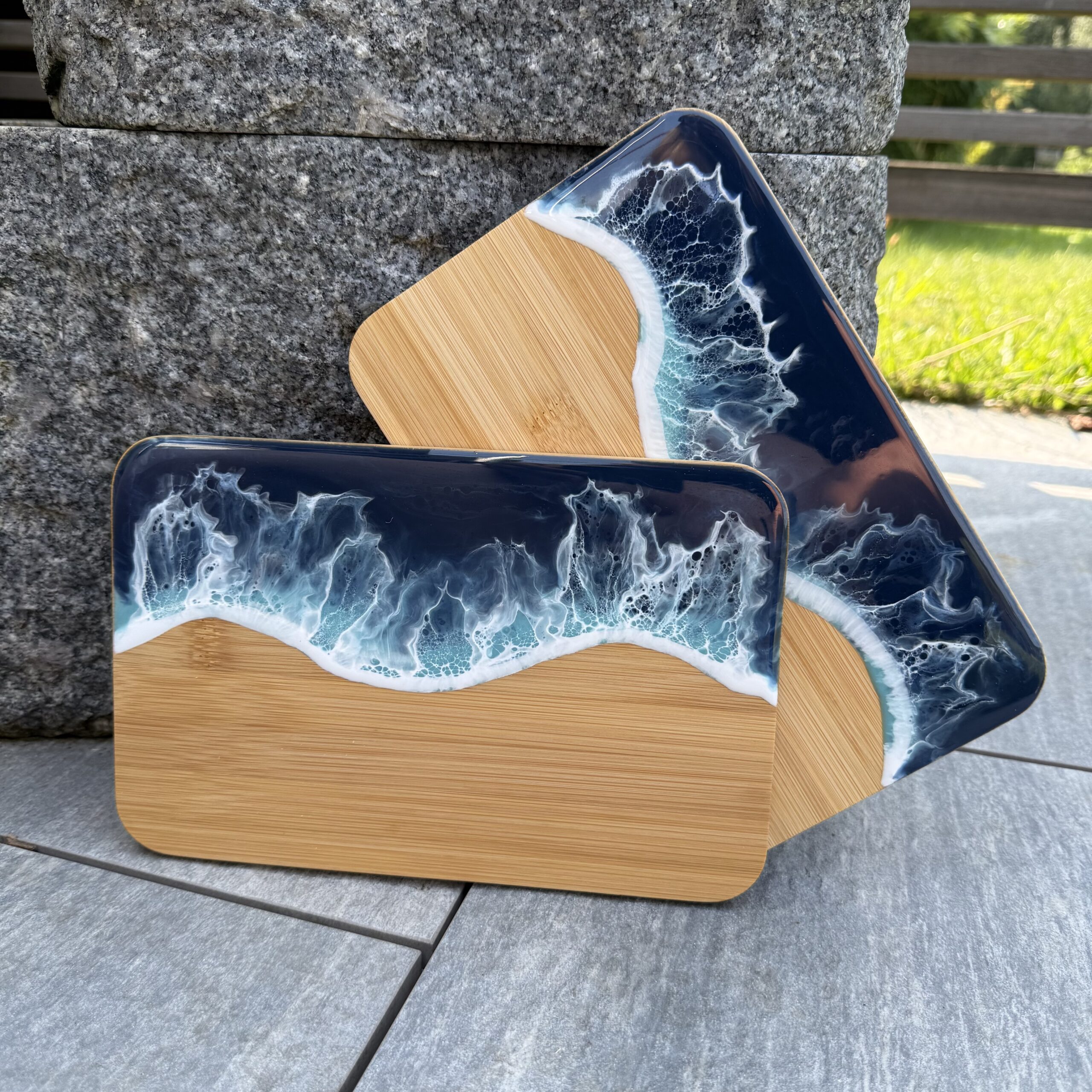Chaque pièce est unique et faite à la main, inspirée par les vagues de la mer. Les couleurs et les motifs peuvent varier, rendant chaque planche très spéciale. Idéal comme planche d'apéritif ou planche de décoration.