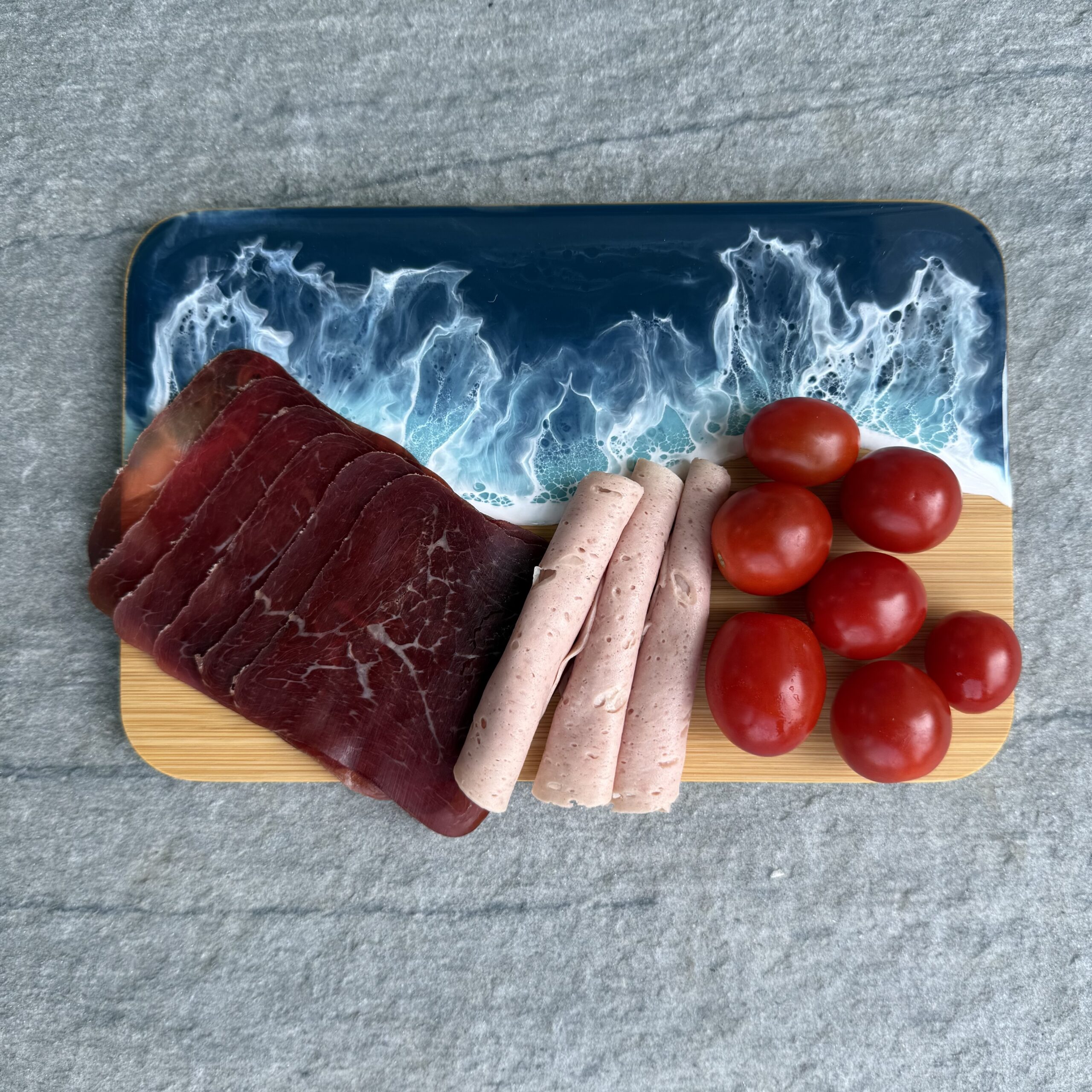 Le design d'Ocean est fait de résine époxy et conçu à la main. La planche est adaptée au contact alimentaire et convainc par sa qualité supérieure. Nous recommandons de couper à l'arrière et de servir à l'avant.