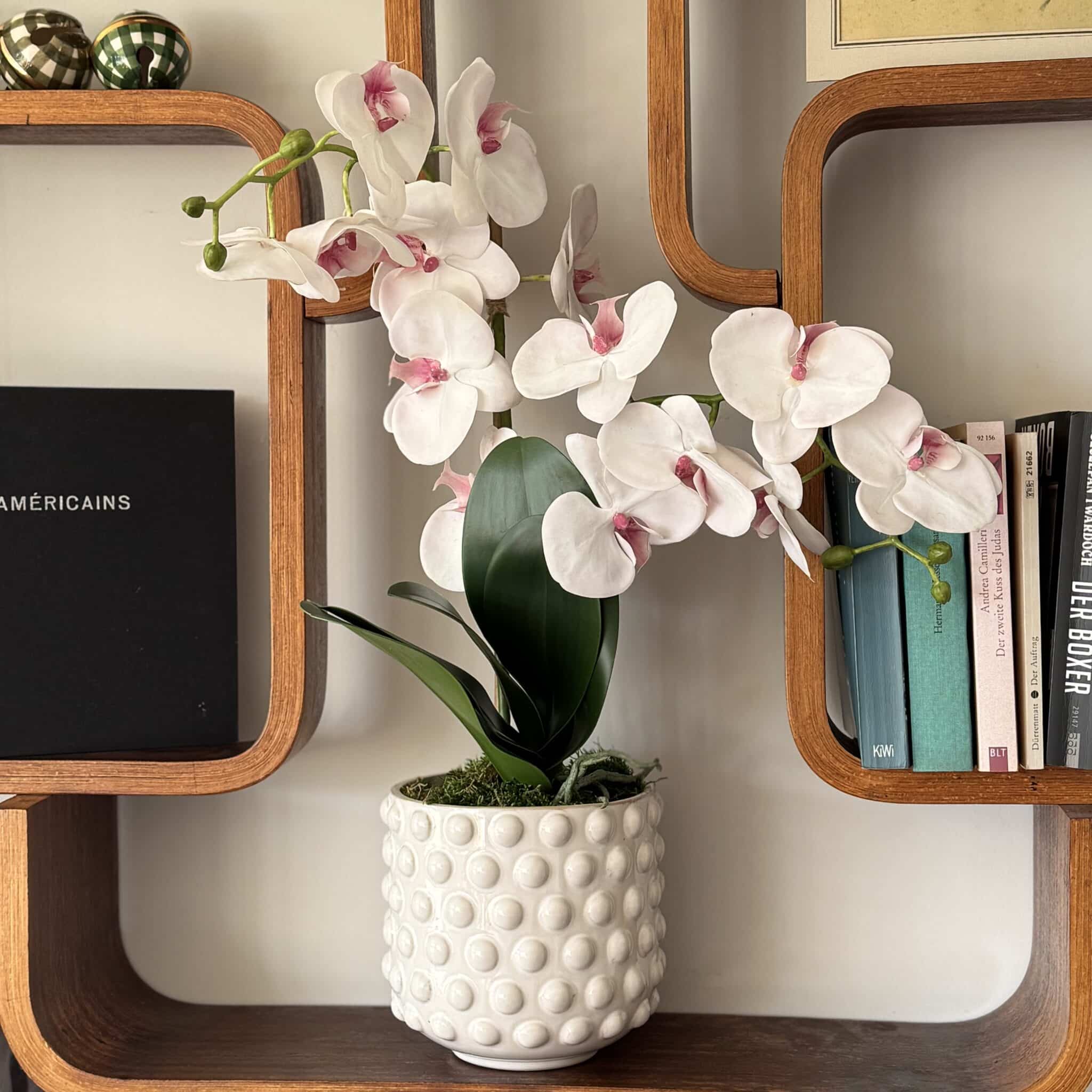 Orchidées artificielles dans un vase en céramique blanc structuré - élégantes, faciles à entretenir et trompeuses.