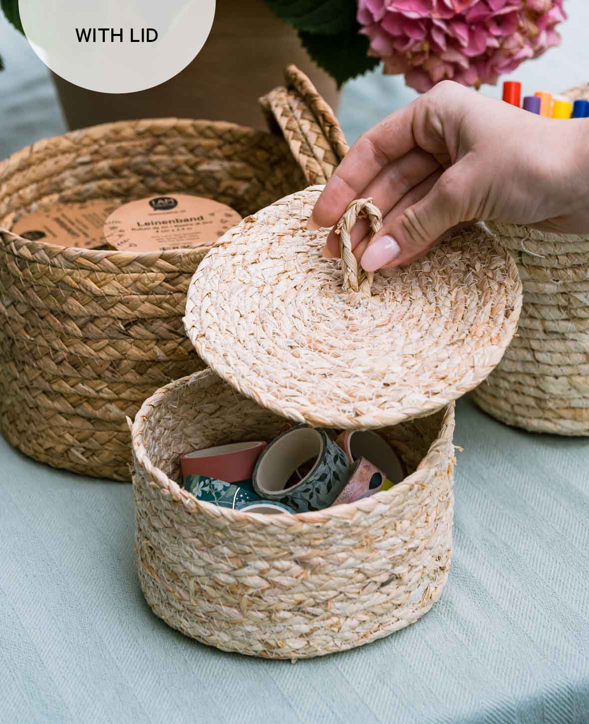 Notre panier de rangement rond avec couvercle en fibres naturelles tressées allie charme naturel et fonctionnalité pratique. Disponible en trois tailles, il offre de multiples possibilités d'utilisation et permet de belles combinaisons.