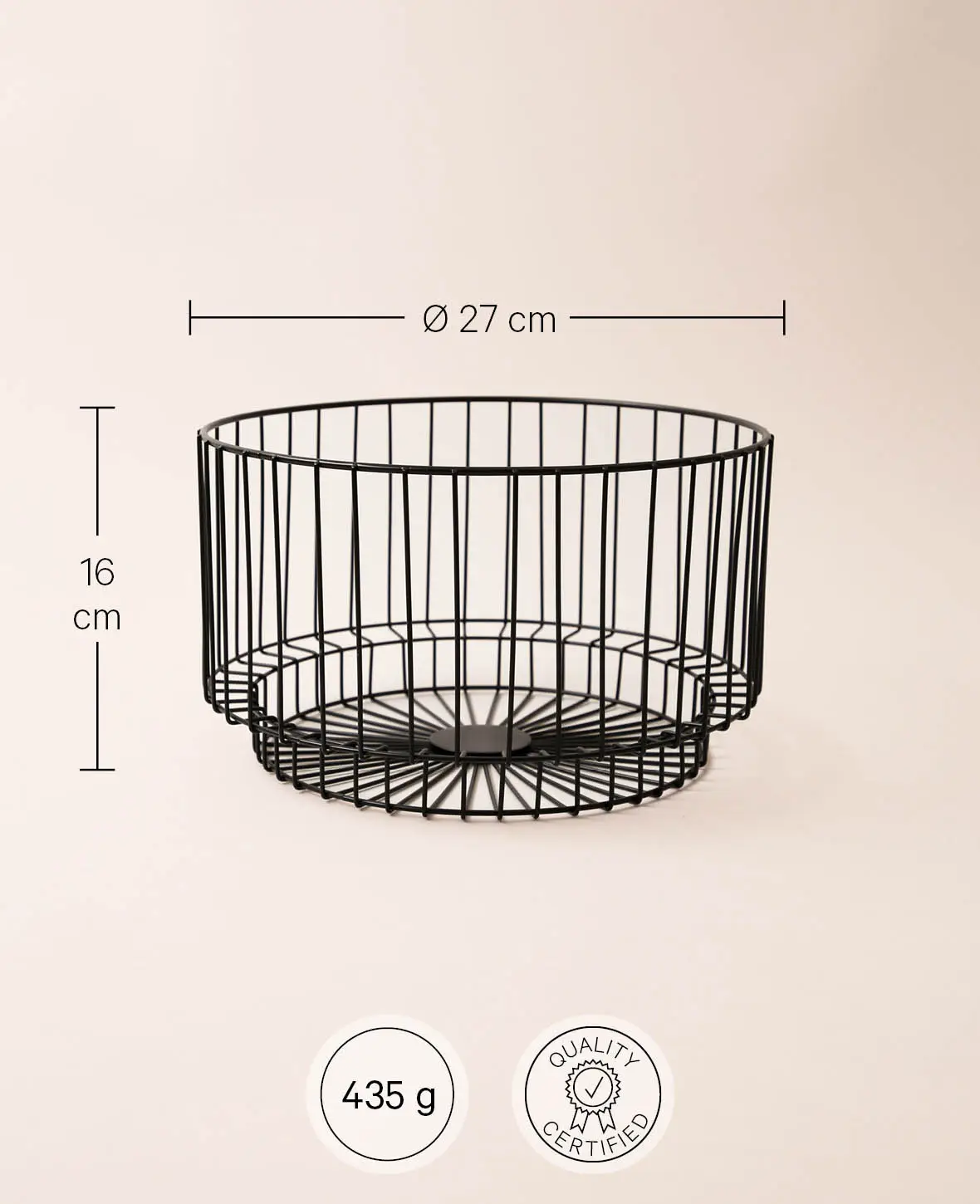 Fabriqué en métal noir mat, ce panier en fil métallique est à la fois robuste et léger, ce qui le rend idéal pour différentes utilisations. Avec un diamètre de 27 cm et une hauteur de 16 cm, il offre suffisamment d'espace de rangement pour les articles de salle de bain, les provisions ou les vêtements.