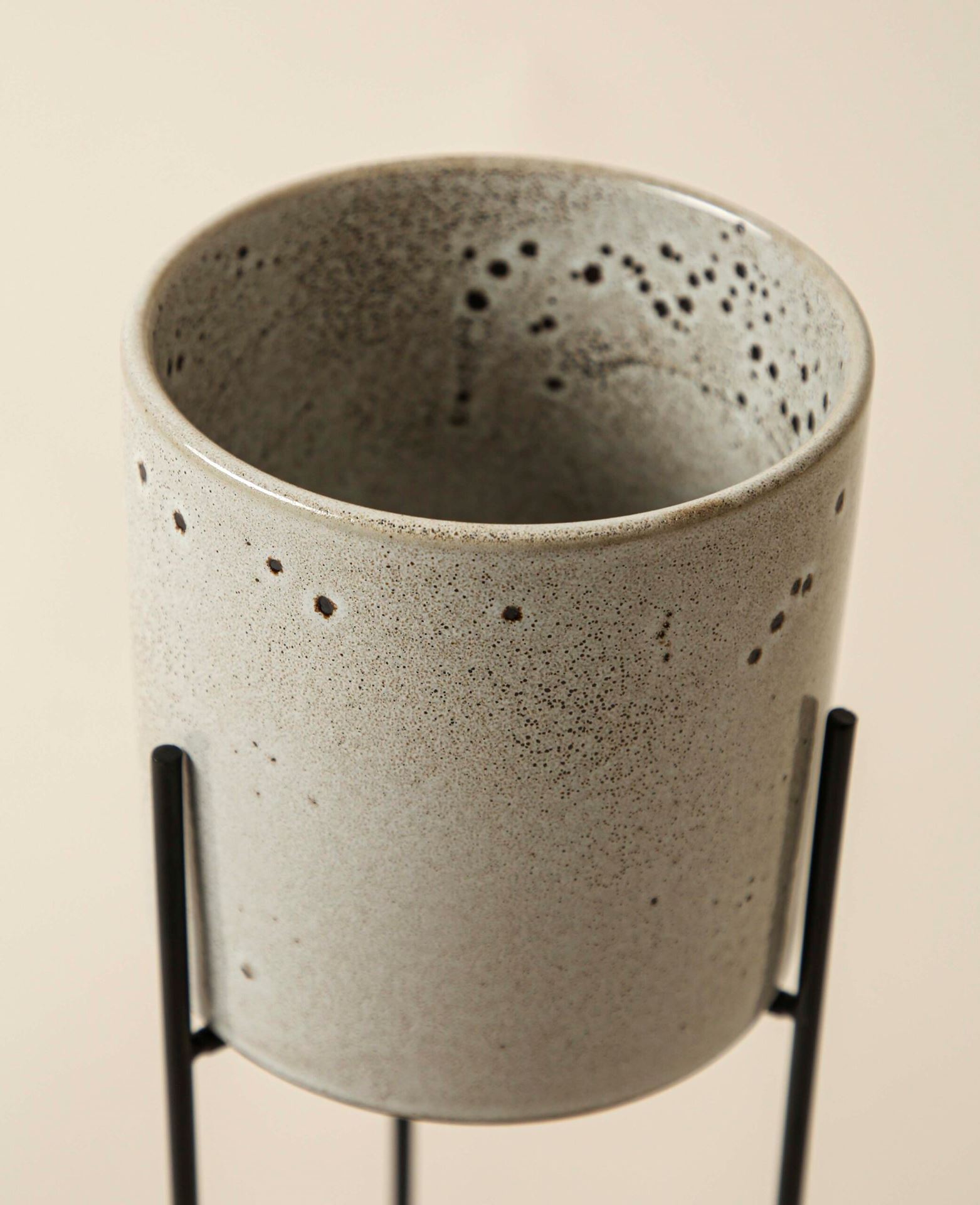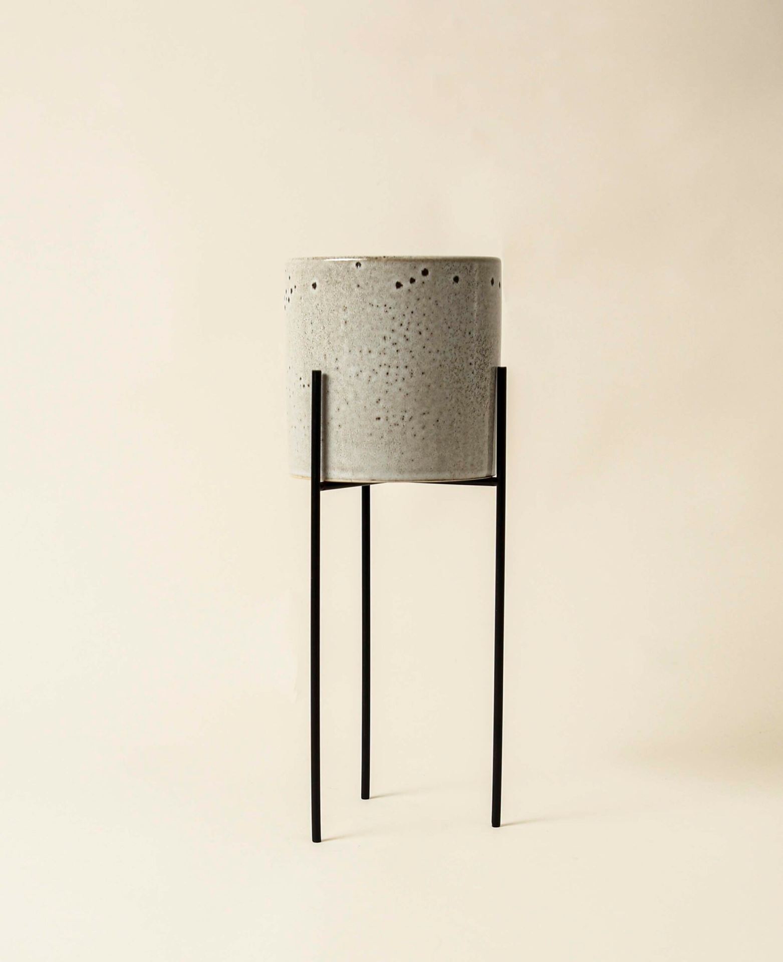 Pot en céramique gris debout avec des pieds en métal et un motif de cuisson noir, Ø 13.5 cm x H 36.5 cm