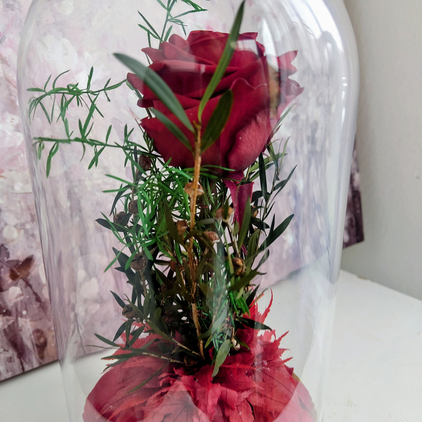 Magnifique cloche en verre avec une rose rouge conservée et des plantes séchées et conservées. Se conserve plusieurs années sans entretien - un cadeau pour un