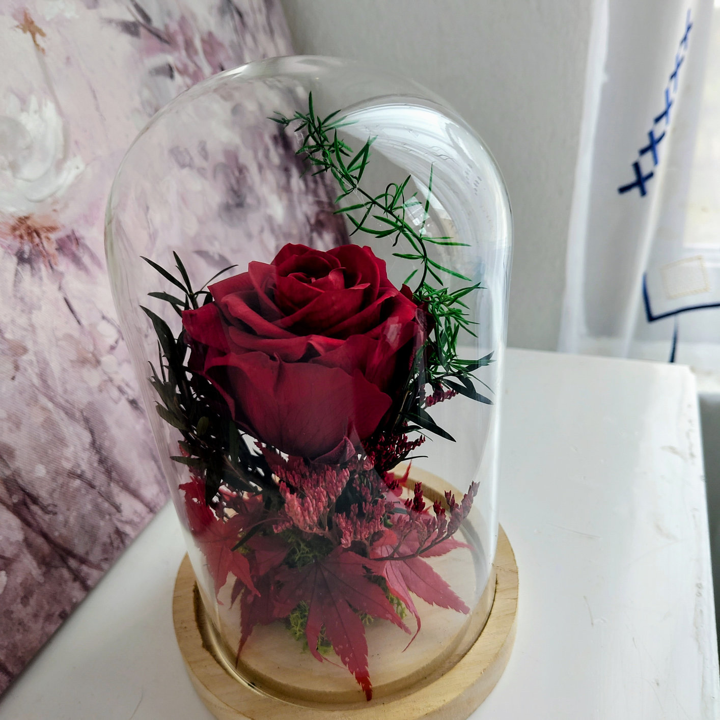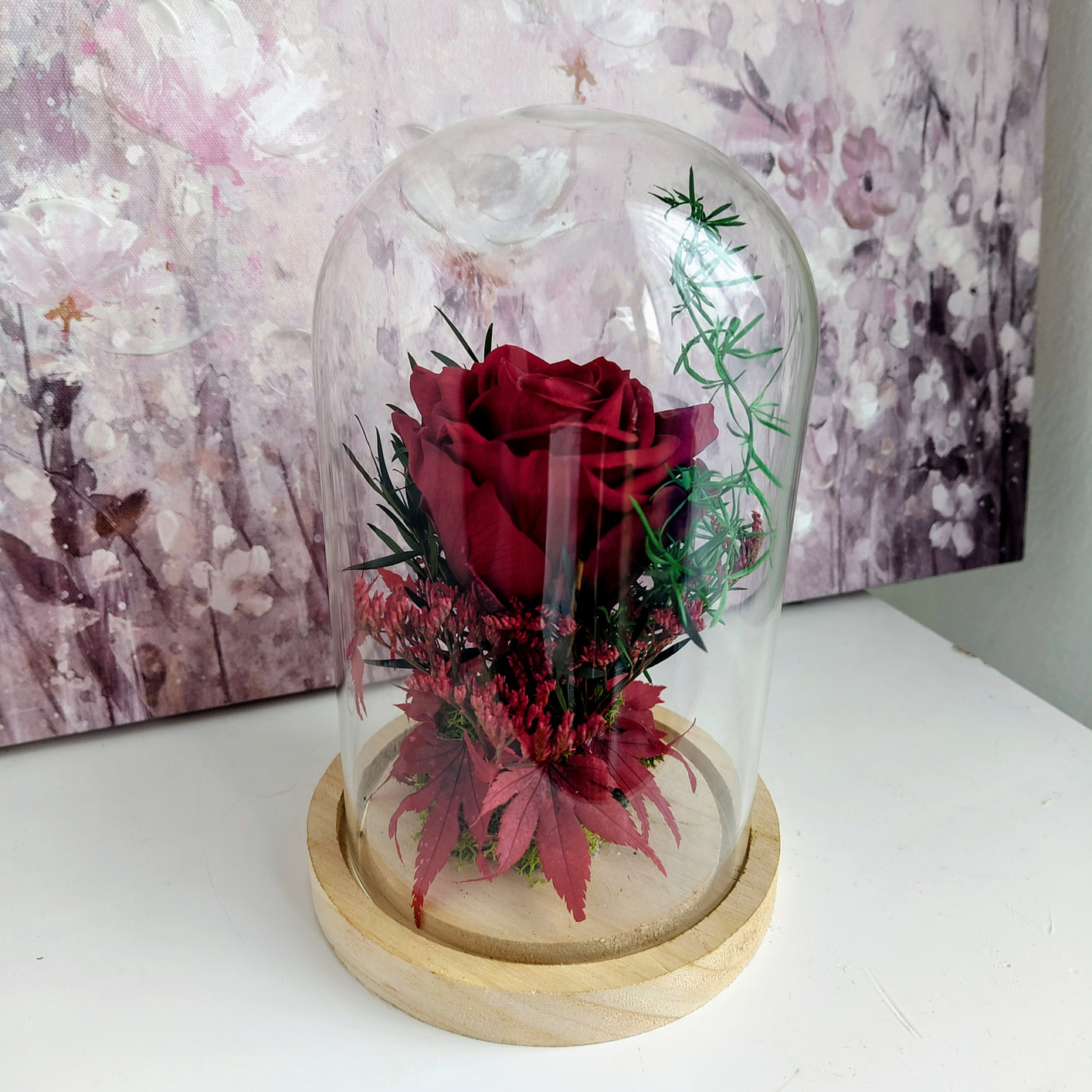 Magnifique cloche en verre avec une rose rouge conservée et des plantes séchées et conservées. Se conserve plusieurs années sans entretien - un cadeau pour un
