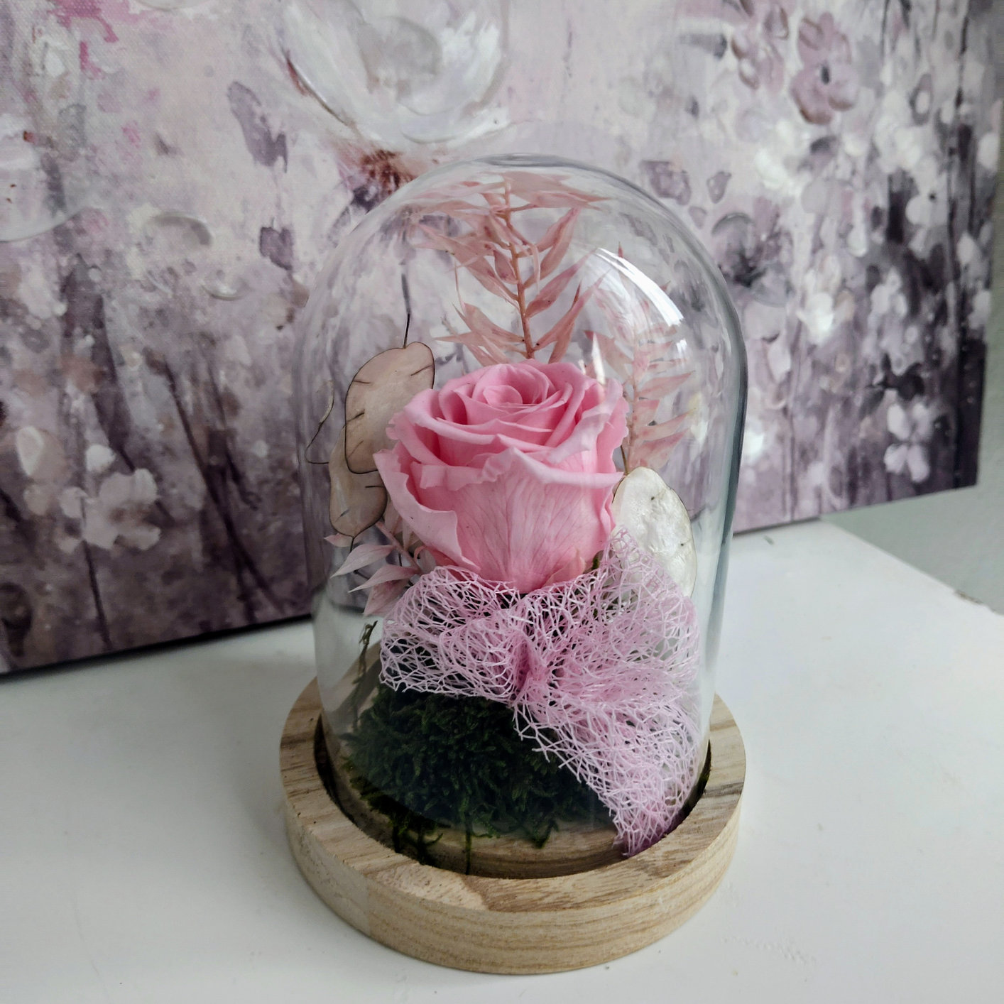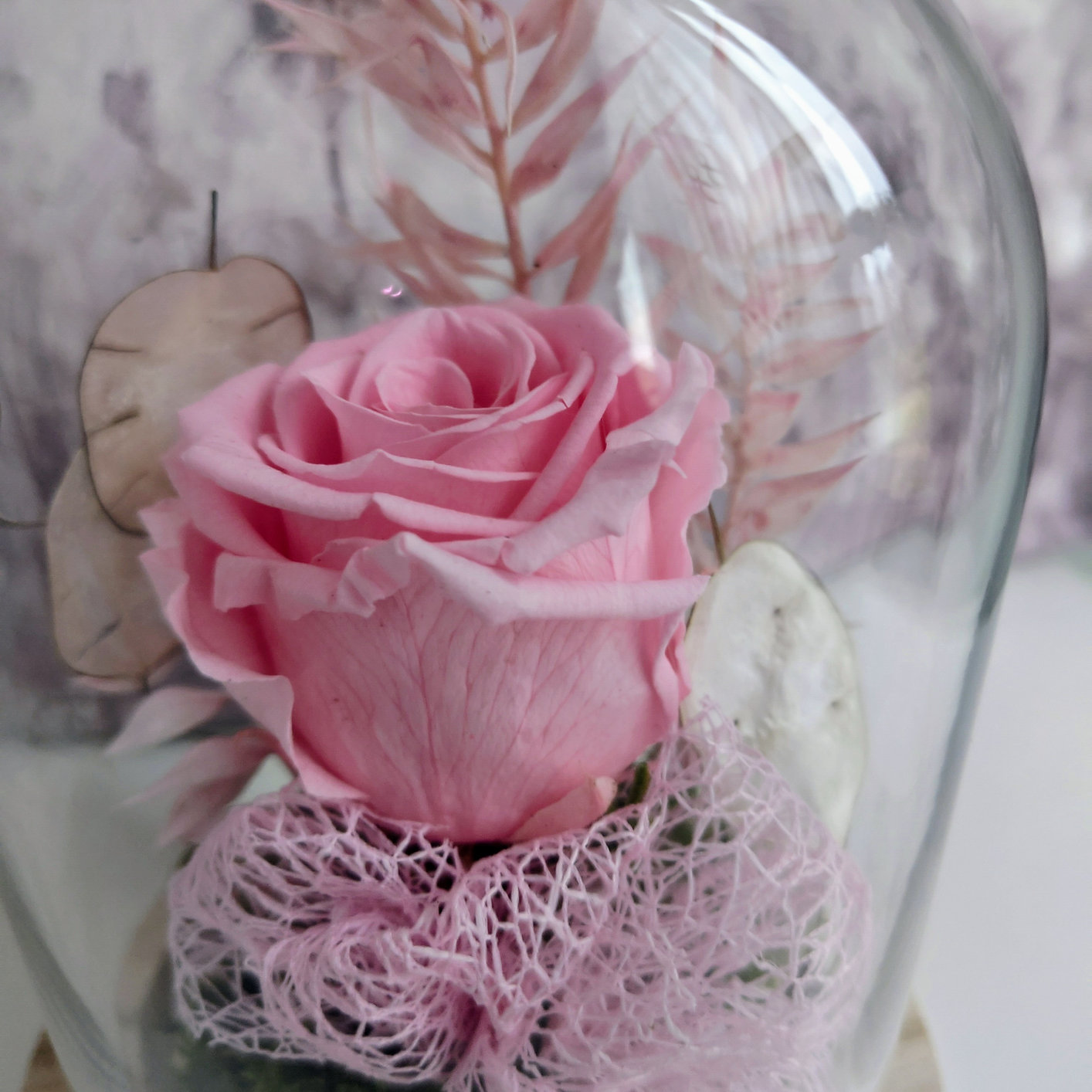 Cette belle cloche en verre contient une magnifique rose rose stabilisée, des plantes séchées et de la mousse stabilisée, elle est fabriquée à la main, ne nécessite aucun entretien et dure plusieurs années.