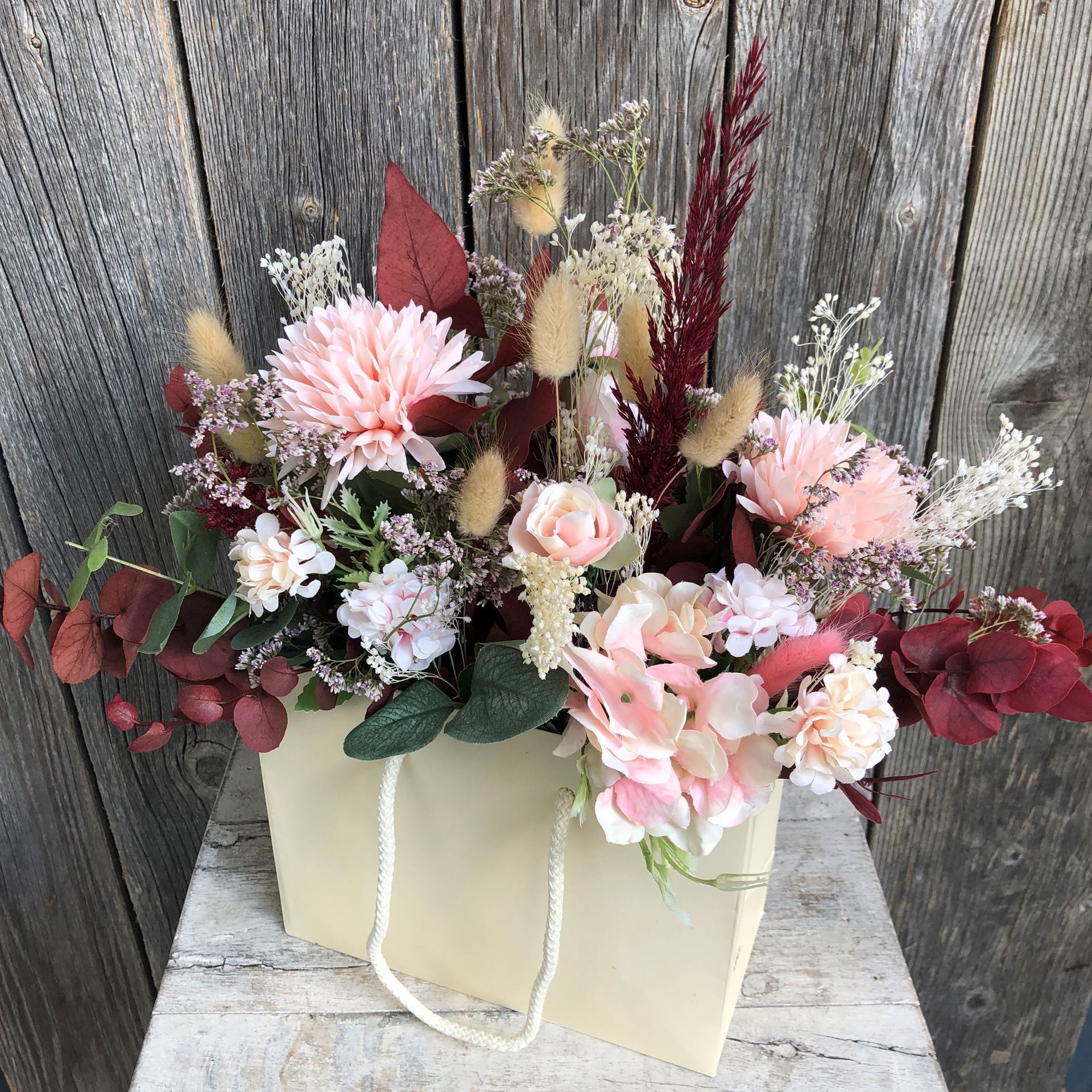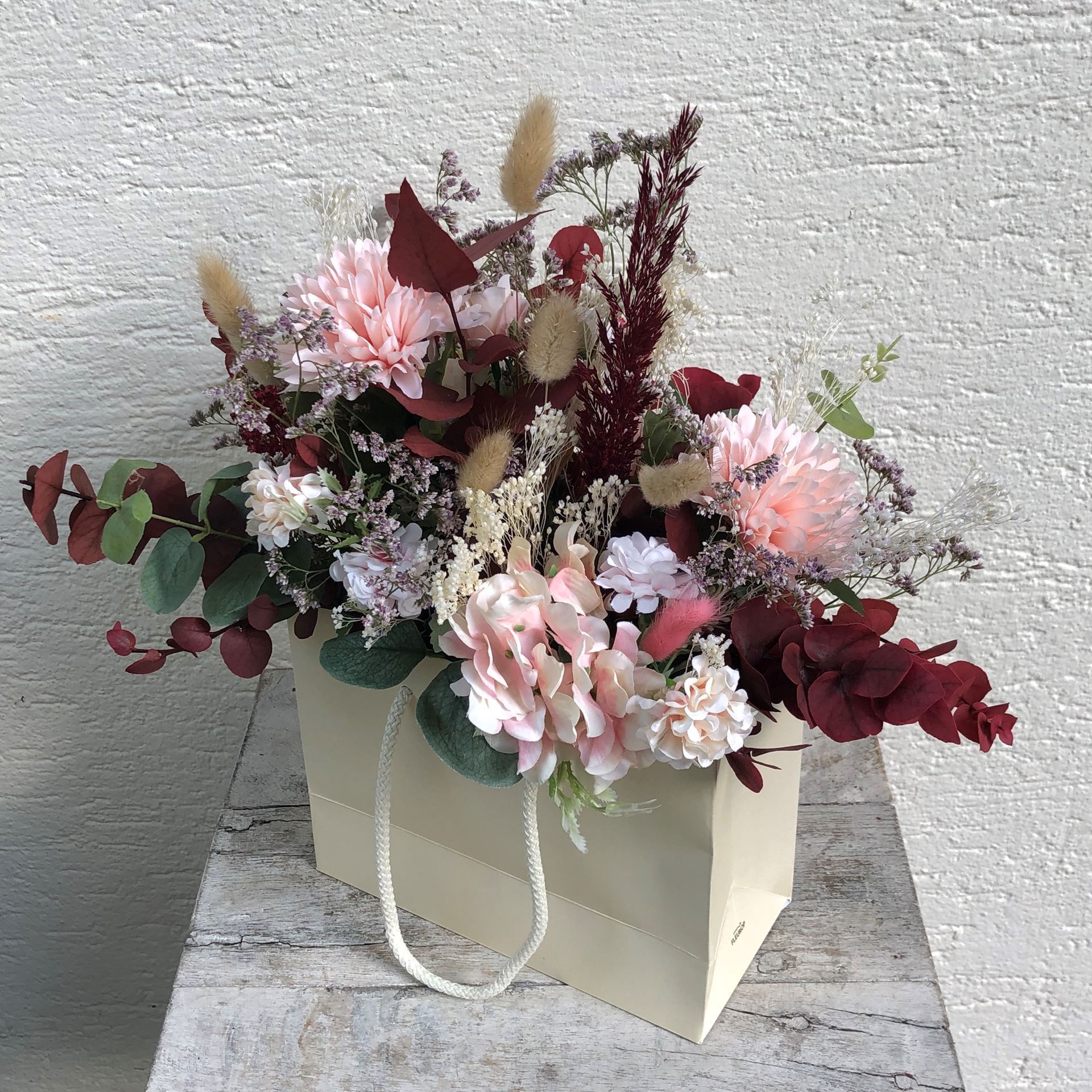 - Les sacs à fleurs en fleurs séchées, fleurs textiles & matériaux artificiels sont composés individuellement par nos soins et peuvent donc varier en termes de disposition et de couleur.